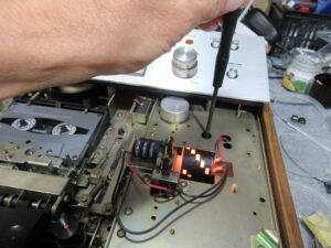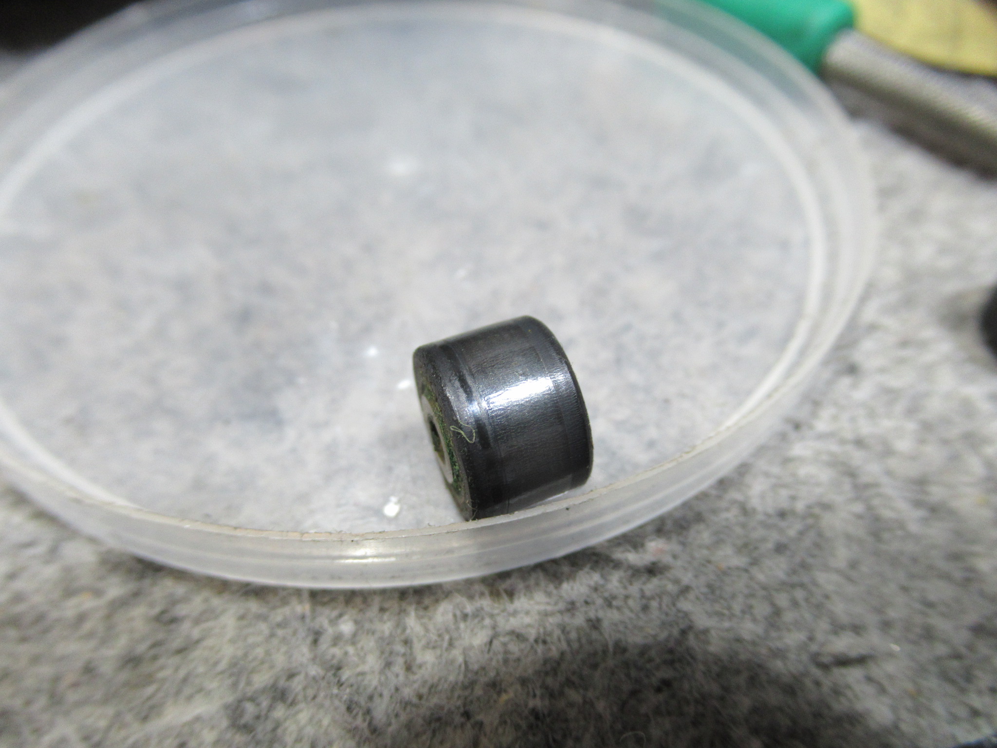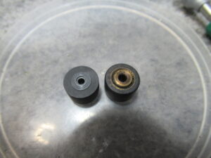 カチカチに硬化しているピンチローラーを交換します。ただし、外径は11mm、幅8mmという標準的なサイズですが、シャフト径が2.5mmという入手困難なサイズですので、2mmのものを加工して取り付けます。なお、穴が偏心すると音揺れの原因になりますので、穴径を拡大するときは、一気にではなく、ドリルの径を0.1mmずつアップしながら行うとうまくいきます。