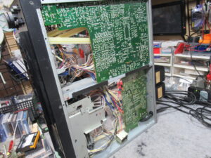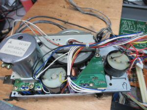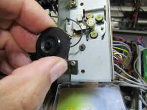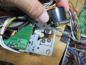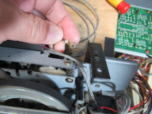 いつも通り作業を進めましたが、何かに引っ掛かってメカを取り出すことができません。そこで、底板を取り外して点検すると、本来は無いはずの謎のビスが取り付けられていました。何の目的でこのような処置がされたのかは永遠に謎です。