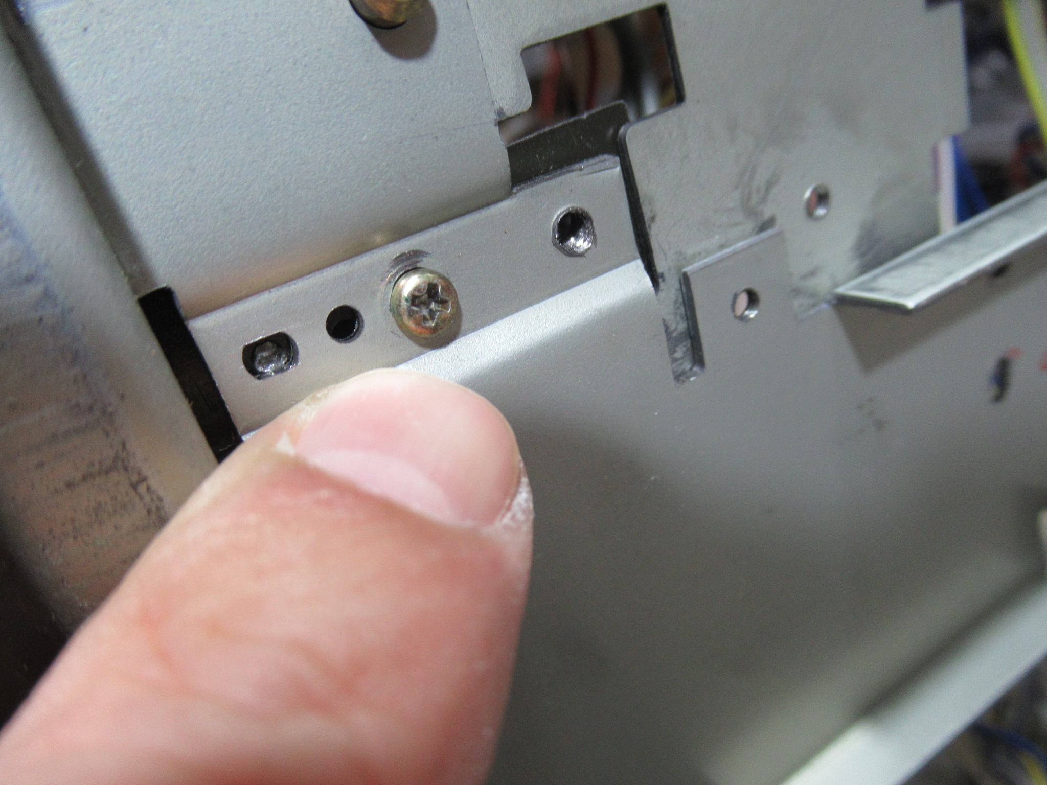 いつも通り作業を進めましたが、何かに引っ掛かってメカを取り出すことができません。そこで、底板を取り外して点検すると、本来は無いはずの謎のビスが取り付けられていました。何の目的でこのような処置がされたのかは永遠に謎です。