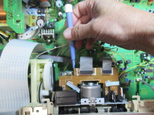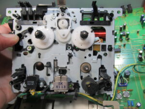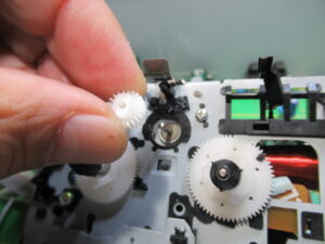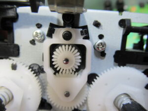 このメカのアイドラーギヤは、ひび割れが発生しやすく、それが原因で動作不良を起こすことがあります。予防措置として、一旦脱着して接着固定します。