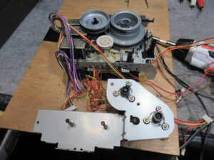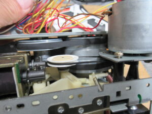 当初、稀にですが、再生ボタンを押してもヘッドが上がらないことがありました。ただし、2・3度繰り返すとその後は正常に動作するようになります。グリス硬化などによってメカの動きが重くなっているのかと思い、点検を行いましたが、特に問題は見られませんでした。このメカは、特殊なカムギヤをソレノイドとフライホイールの動力によって回転させて切り替えるシステムになっていますので、各部の摩耗や変形によるちょっとしたタイミングの狂いが影響しているのかもしれません。オーナー様にその旨お知らせし、その後何日か様子を見ましたが、結局その後は症状は発生しなくなりました。