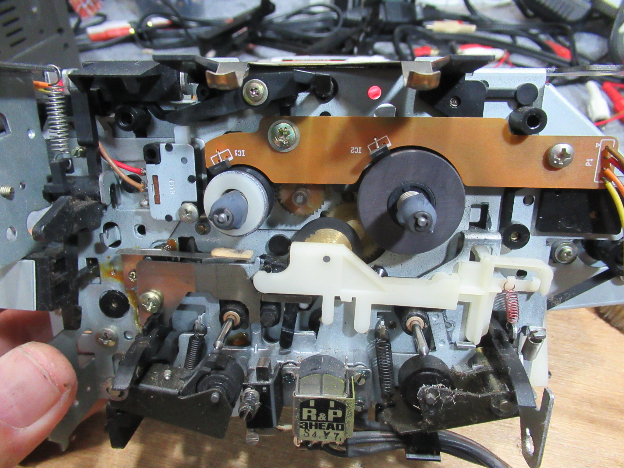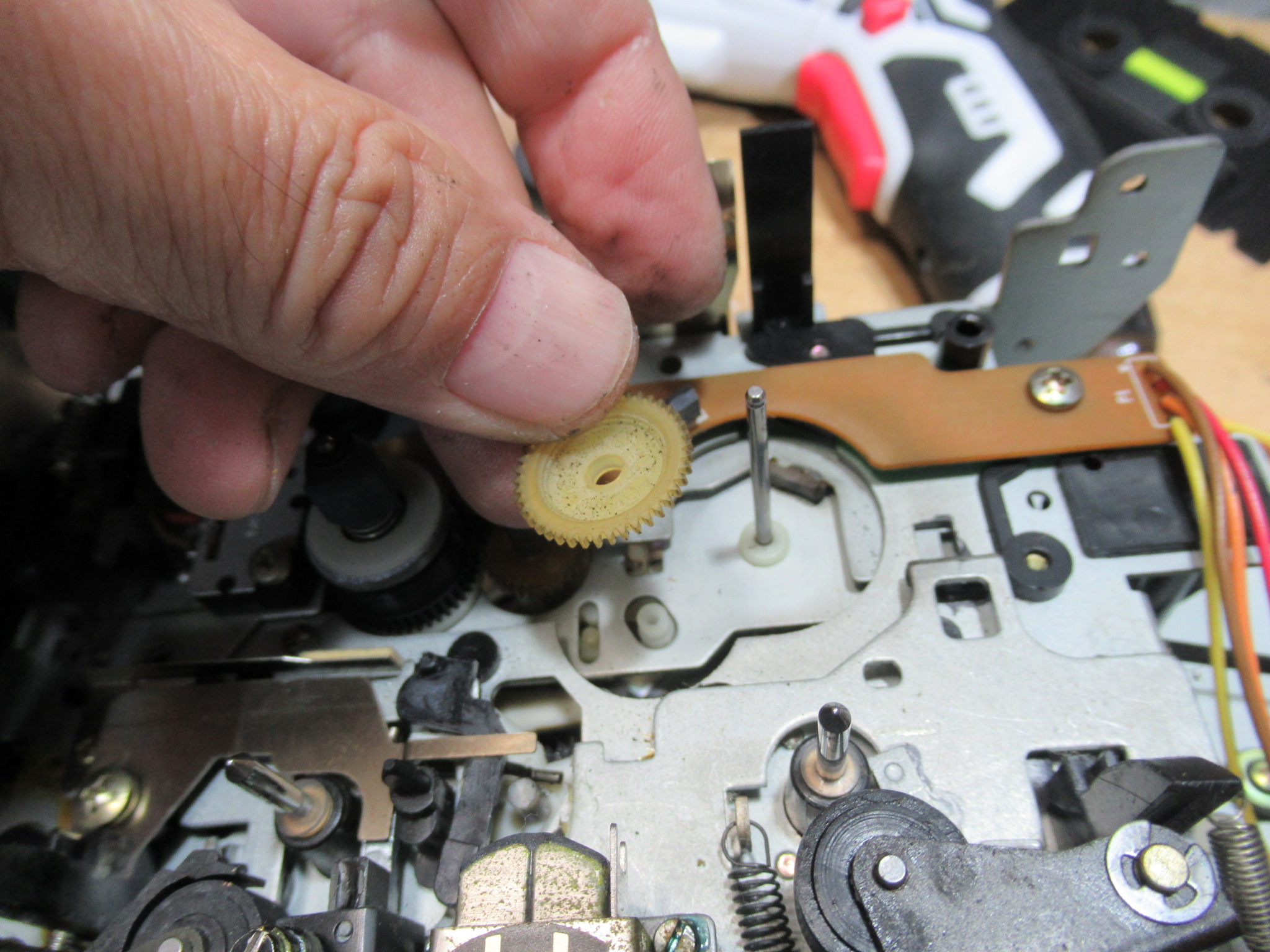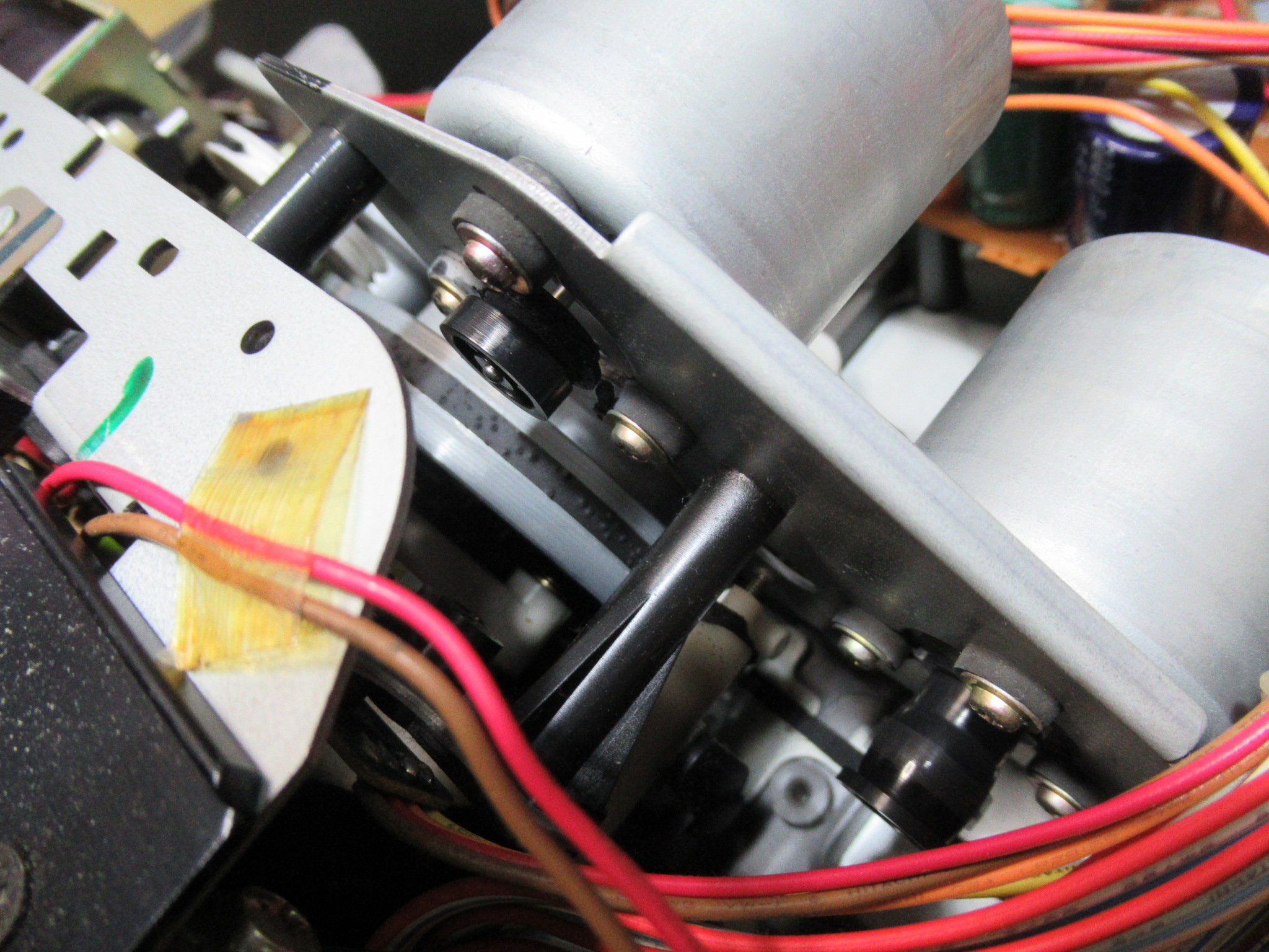 当初、稀にですが、再生ボタンを押してもヘッドが上がらないことがありました。ただし、2・3度繰り返すとその後は正常に動作するようになります。グリス硬化などによってメカの動きが重くなっているのかと思い、点検を行いましたが、特に問題は見られませんでした。このメカは、特殊なカムギヤをソレノイドとフライホイールの動力によって回転させて切り替えるシステムになっていますので、各部の摩耗や変形によるちょっとしたタイミングの狂いが影響しているのかもしれません。オーナー様にその旨お知らせし、その後何日か様子を見ましたが、結局その後は症状は発生しなくなりました。