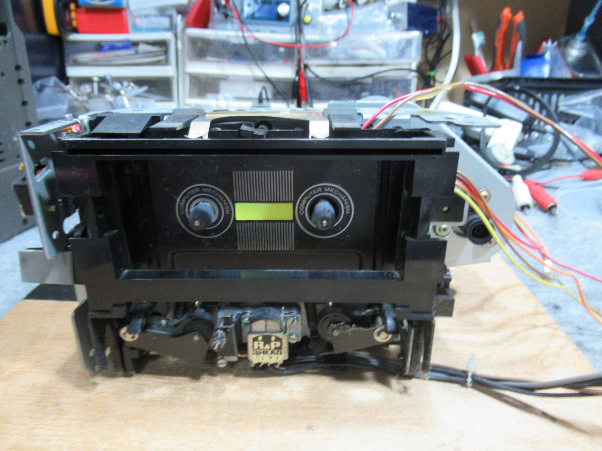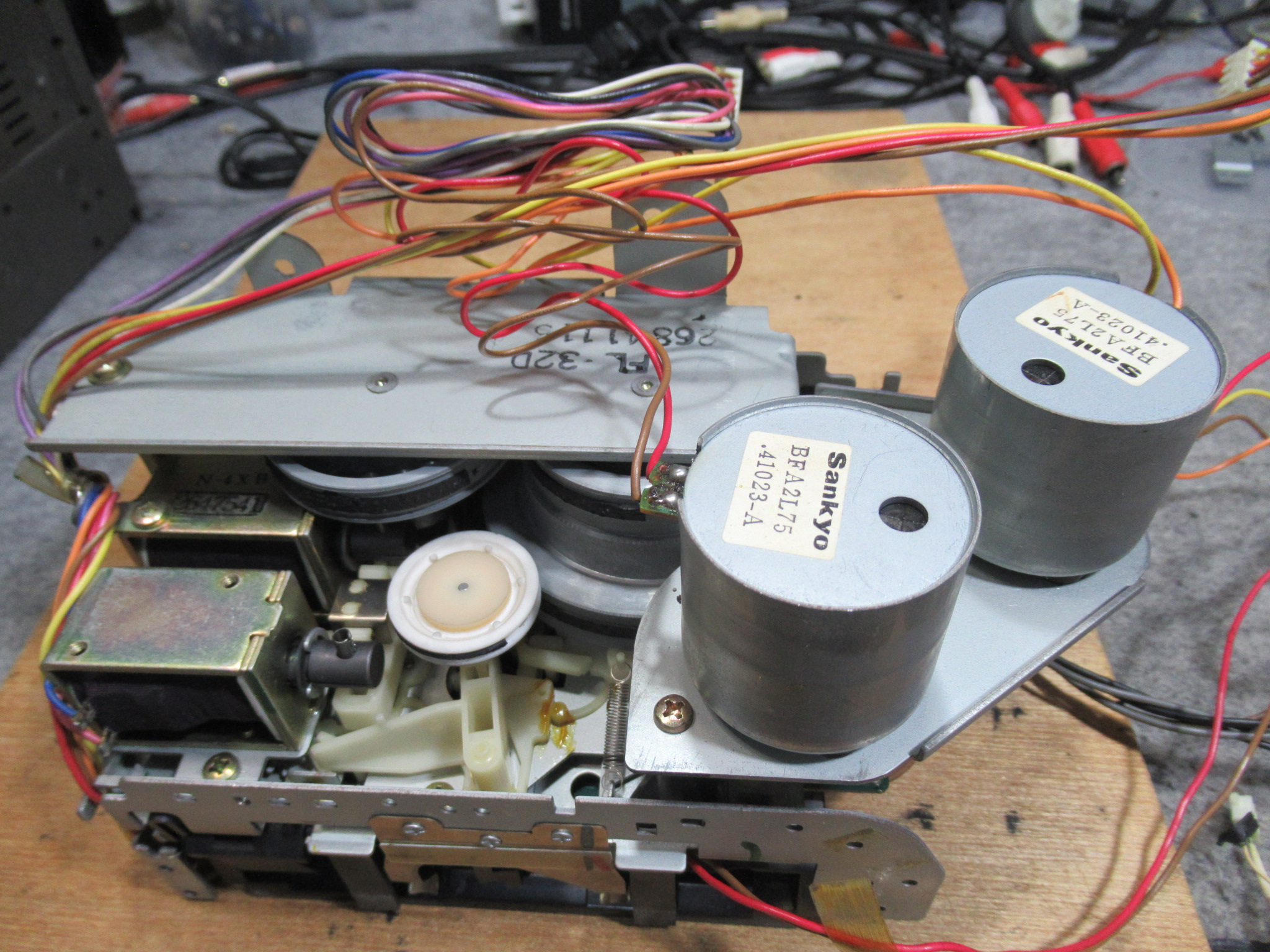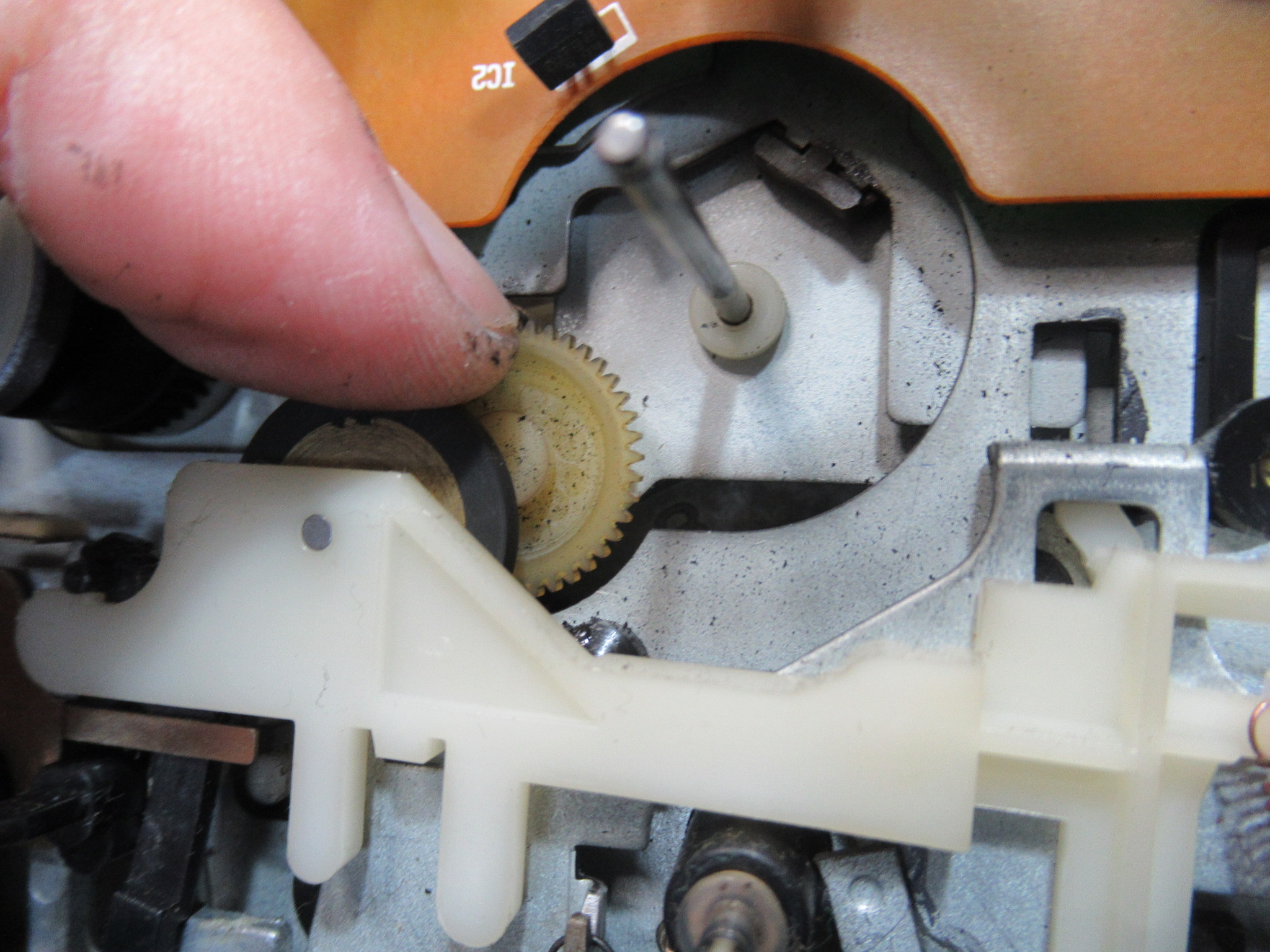 当初、稀にですが、再生ボタンを押してもヘッドが上がらないことがありました。ただし、2・3度繰り返すとその後は正常に動作するようになります。グリス硬化などによってメカの動きが重くなっているのかと思い、点検を行いましたが、特に問題は見られませんでした。このメカは、特殊なカムギヤをソレノイドとフライホイールの動力によって回転させて切り替えるシステムになっていますので、各部の摩耗や変形によるちょっとしたタイミングの狂いが影響しているのかもしれません。オーナー様にその旨お知らせし、その後何日か様子を見ましたが、結局その後は症状は発生しなくなりました。