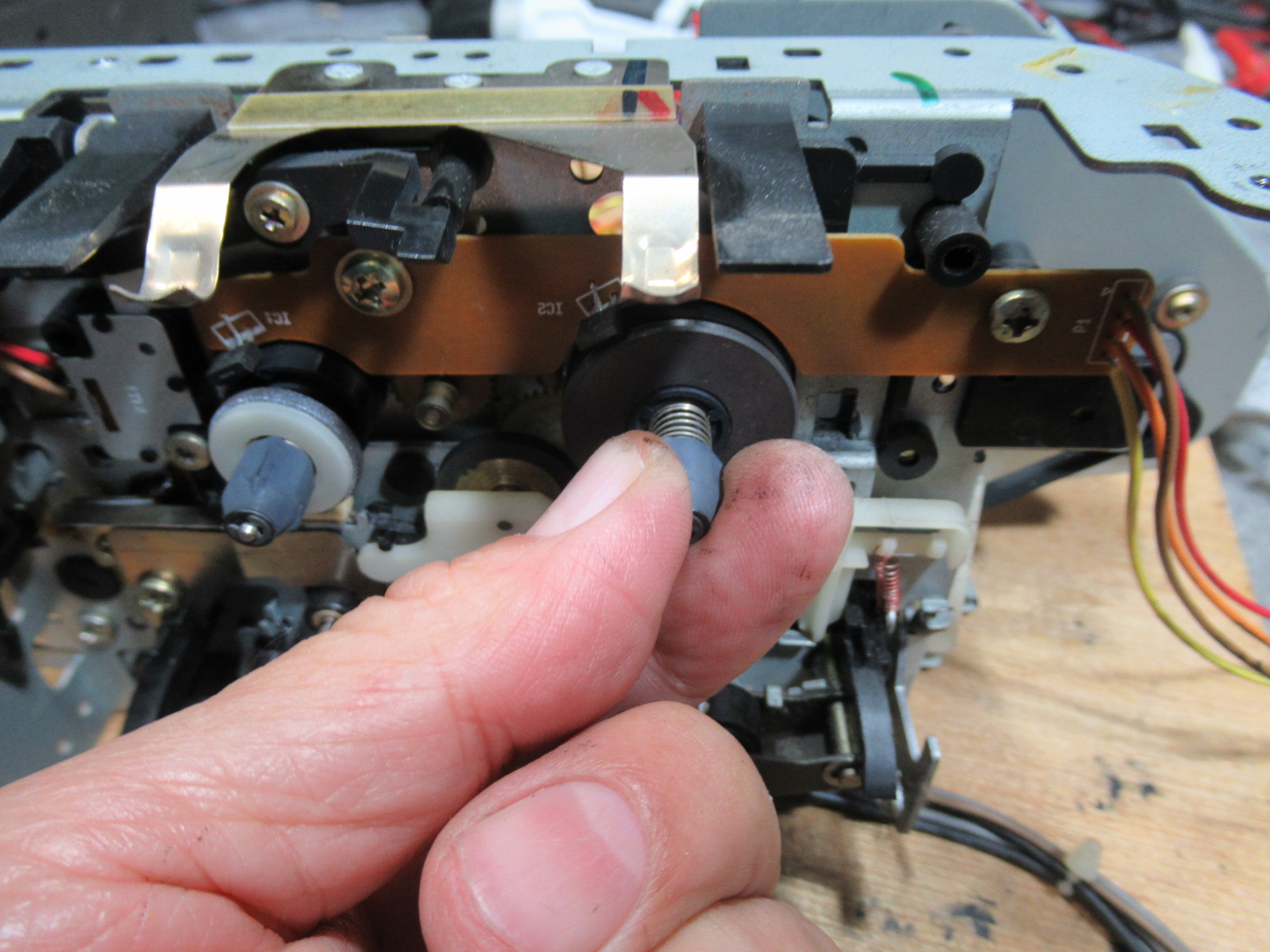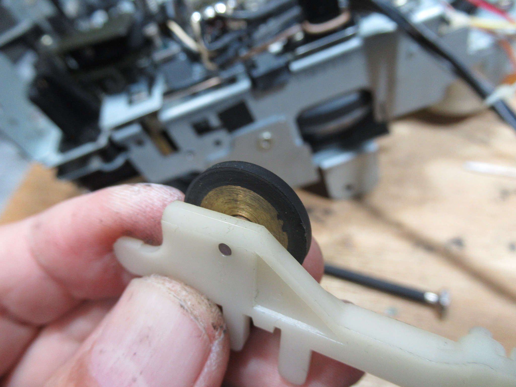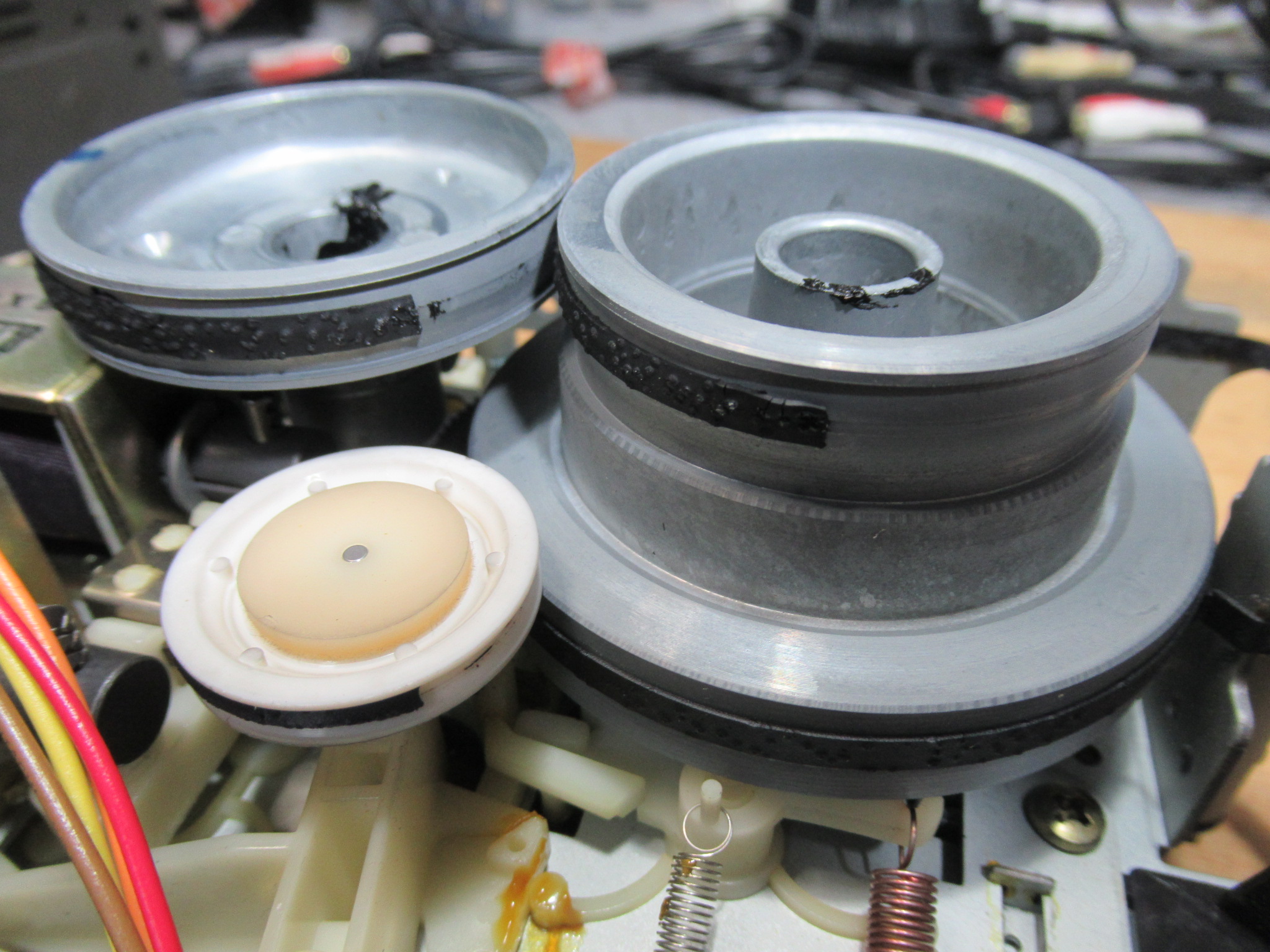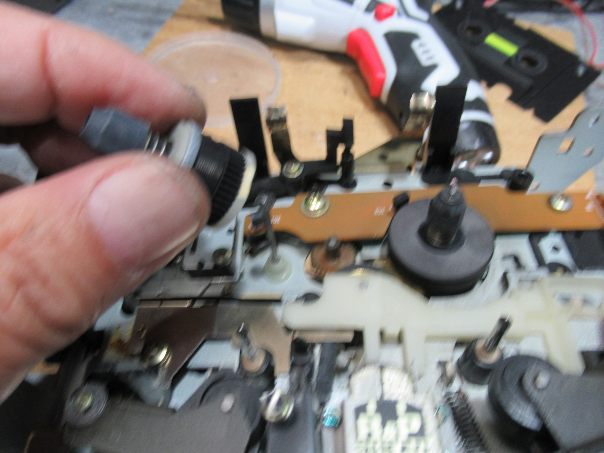オーナー様に了解を得て、モーターを交換しましたが、残念ながら状況は変わりませんでした。ということは、キャプスタンと本体側とのクリアランスの問題でしょうか?つまり、金属が温まることによって膨張し、クリアランスが小さくなって抵抗が大きくなり、速度が低下するということです。そこで、再度メカを降ろして、キャプスタン部分に処置していたグリスを機械油に置換しました。