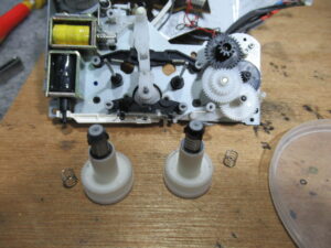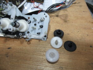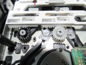 向かって右下にテープガイドを動かすギヤがありますので、ここと、ローディング用プーリーを回してテープを救出します。