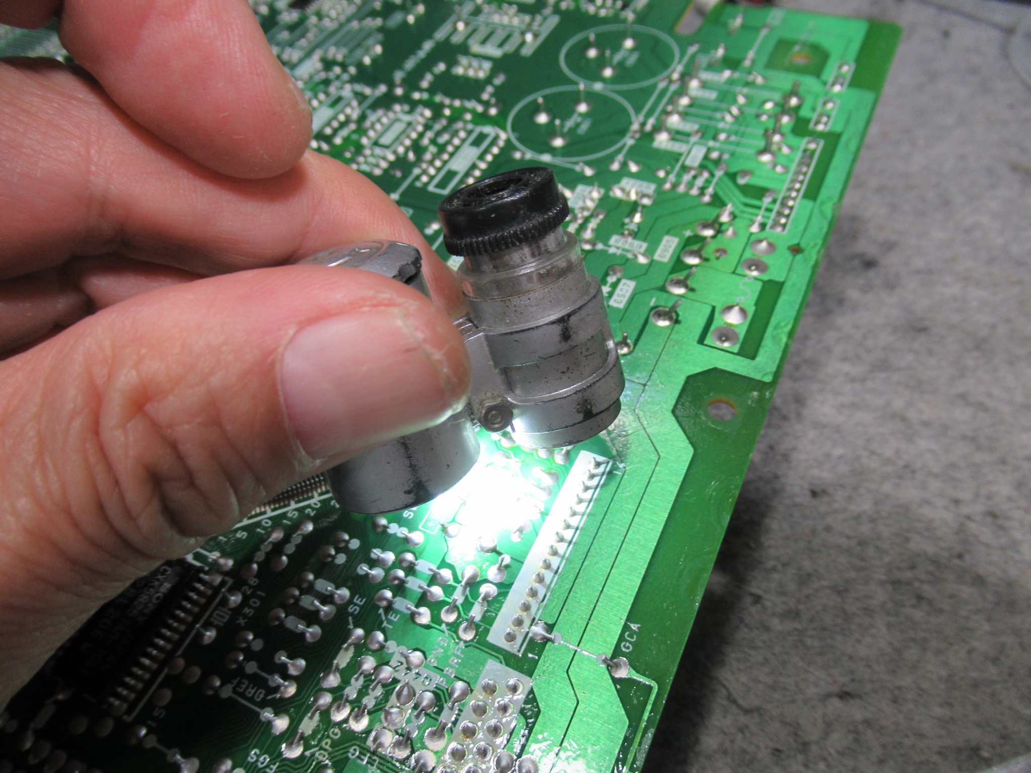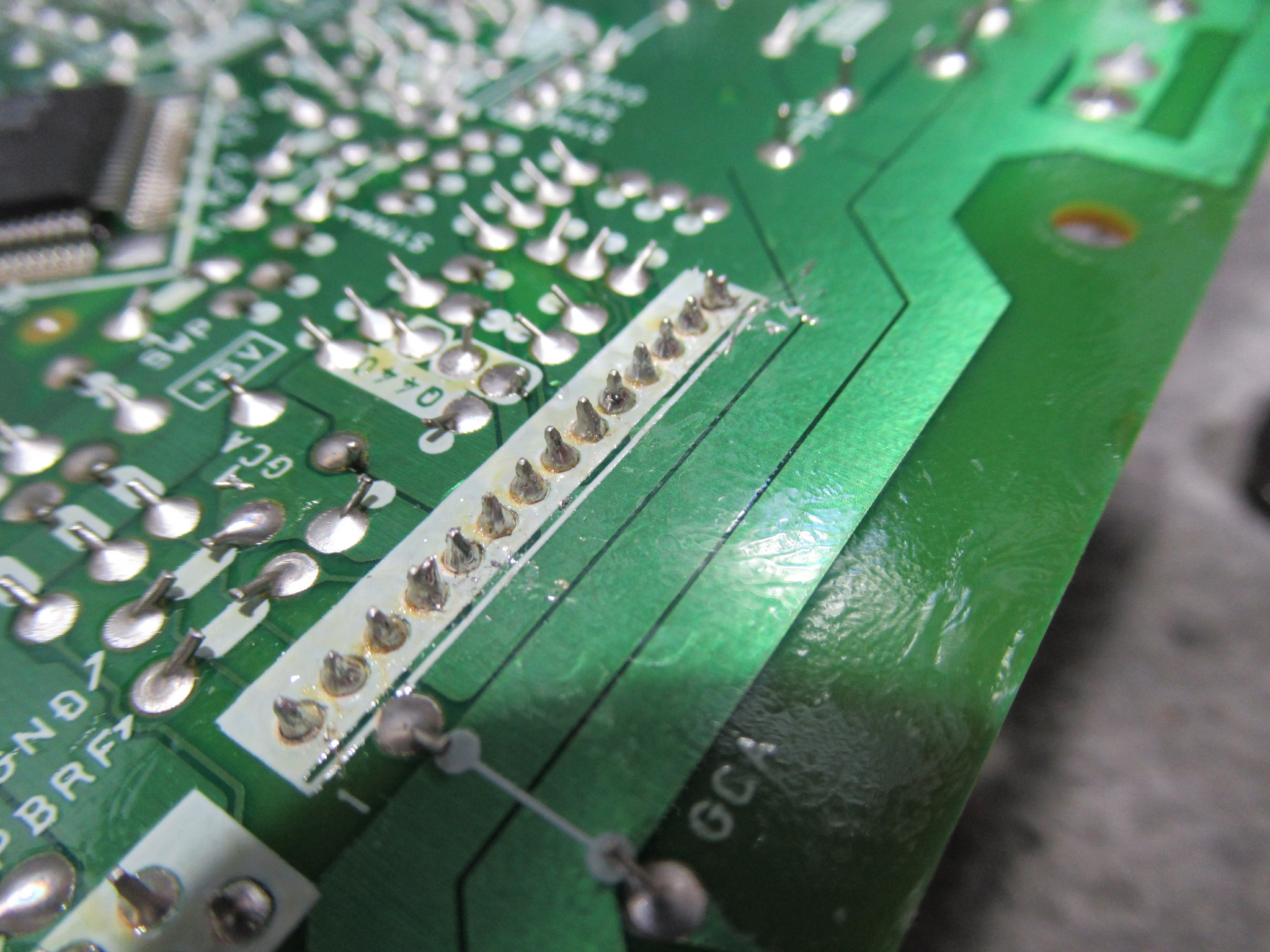 肉眼ではわかりませんでしたが、拡大鏡で半田クラックを発見しました。ヘッドのコネクタ部です。普通、こういうところには半田クラックは発生しませんので、以前修理された方がコネクタを引き抜くときに前後左右に揺すったのでしょうか?早速、半田を盛ります。