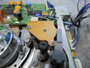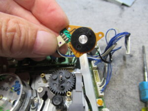 メカの動作を検知するロータリーエンコーダーを取り外します。分解はできませんので、隙間から接点復活剤を処置します。