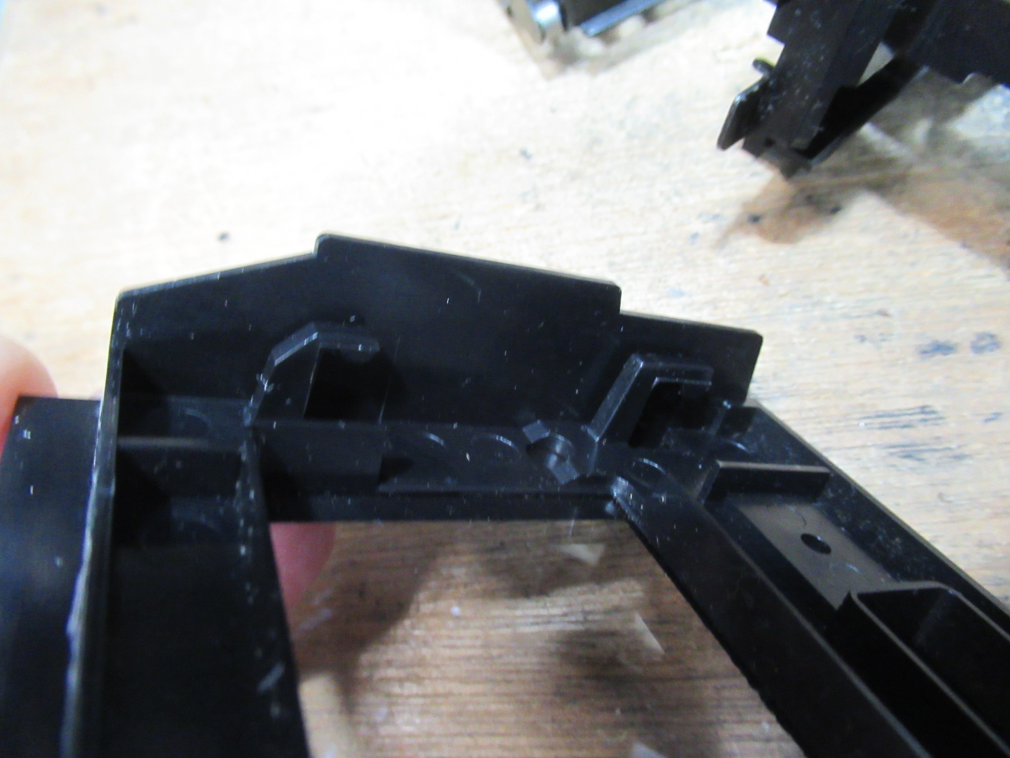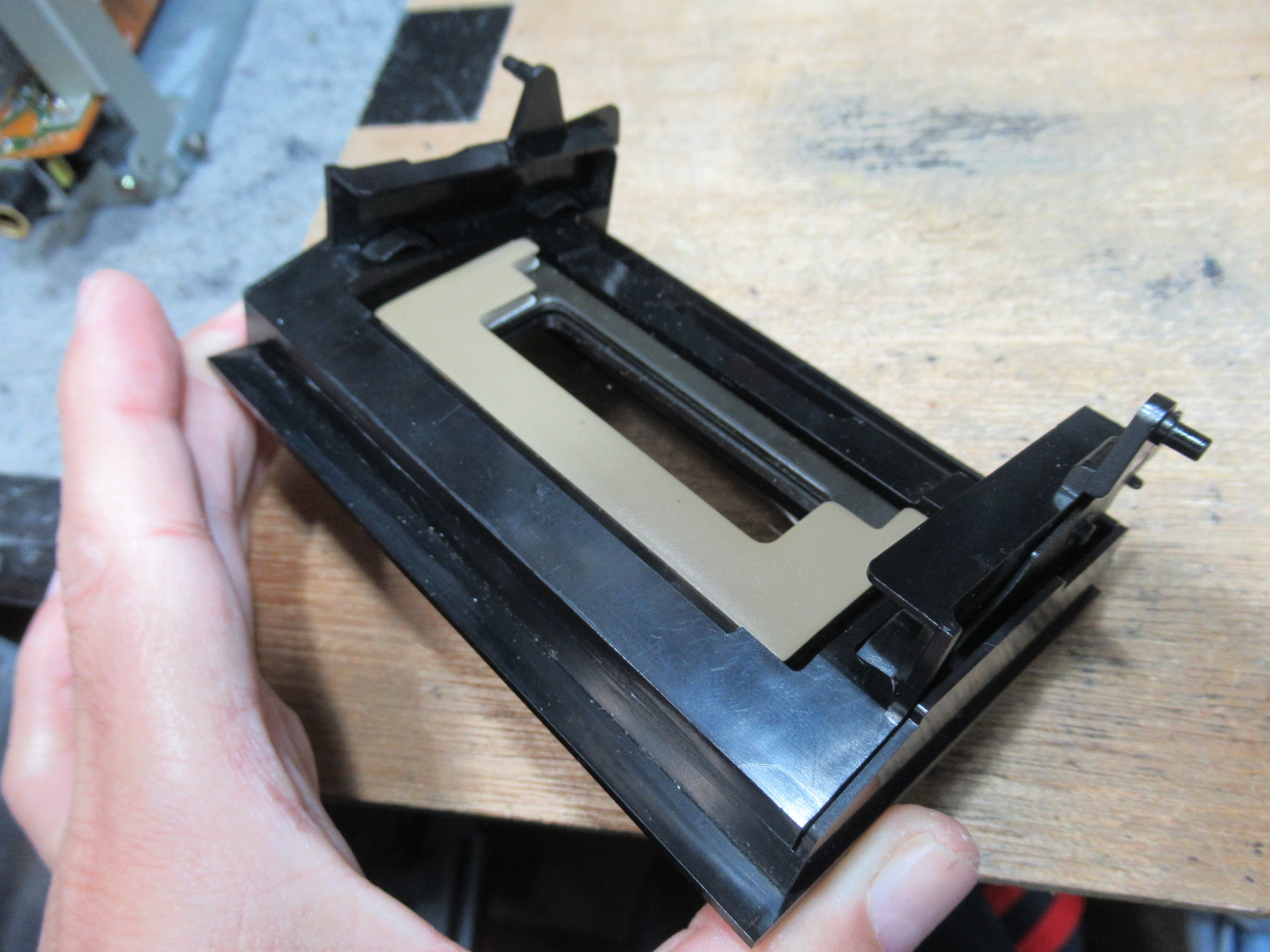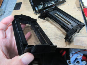 カセットホルダーを分解します。両脇にはカセットを押さえ付ける樹脂製のバネが内蔵されています。
