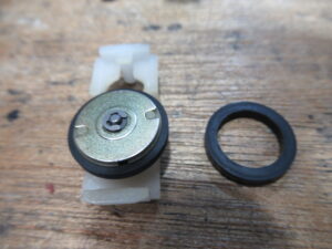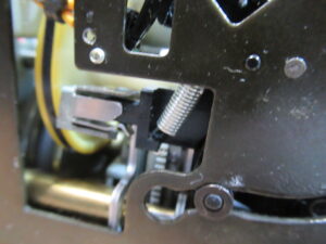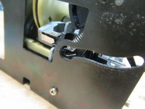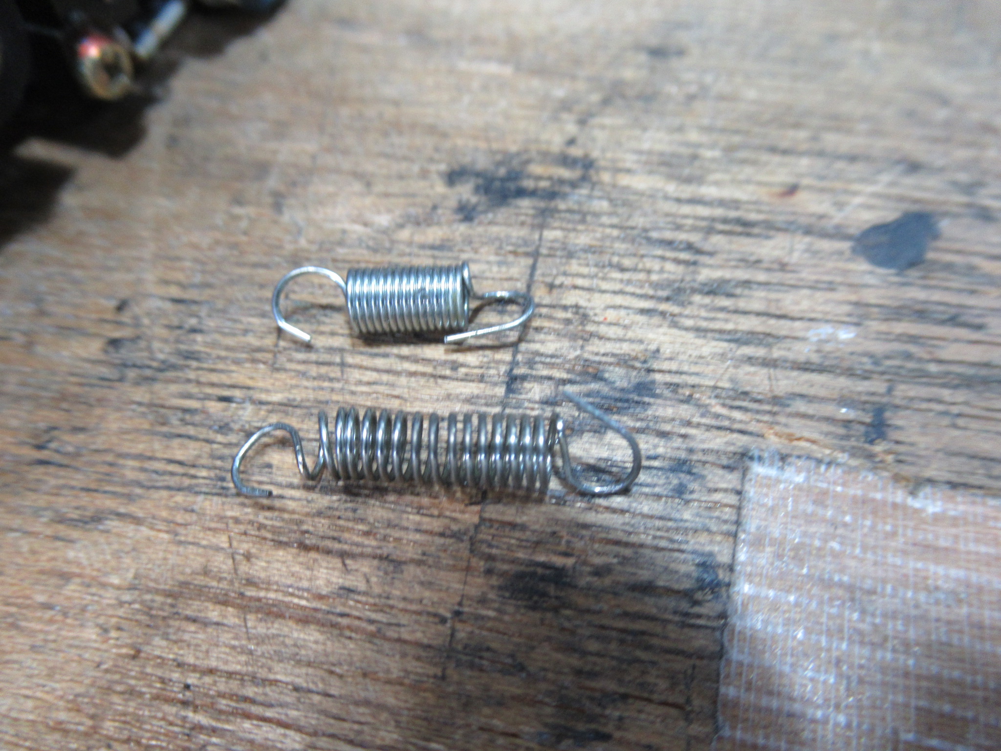 見た目では分かりませんでしたが、取り外してみると、バネが人為的に伸ばされていましたので交換します(上が正常なもの)。最初は理由がわかりませんでしたが、