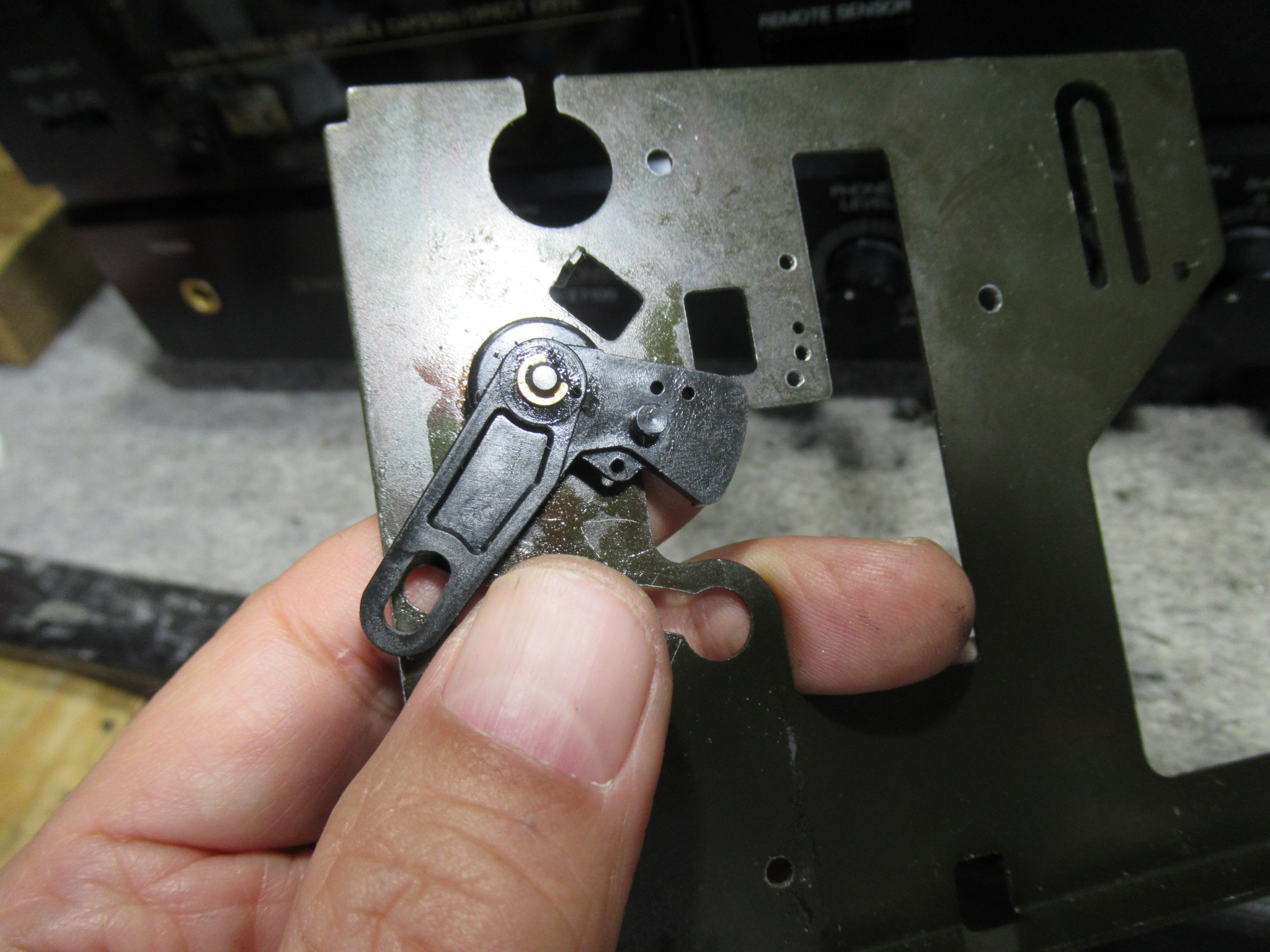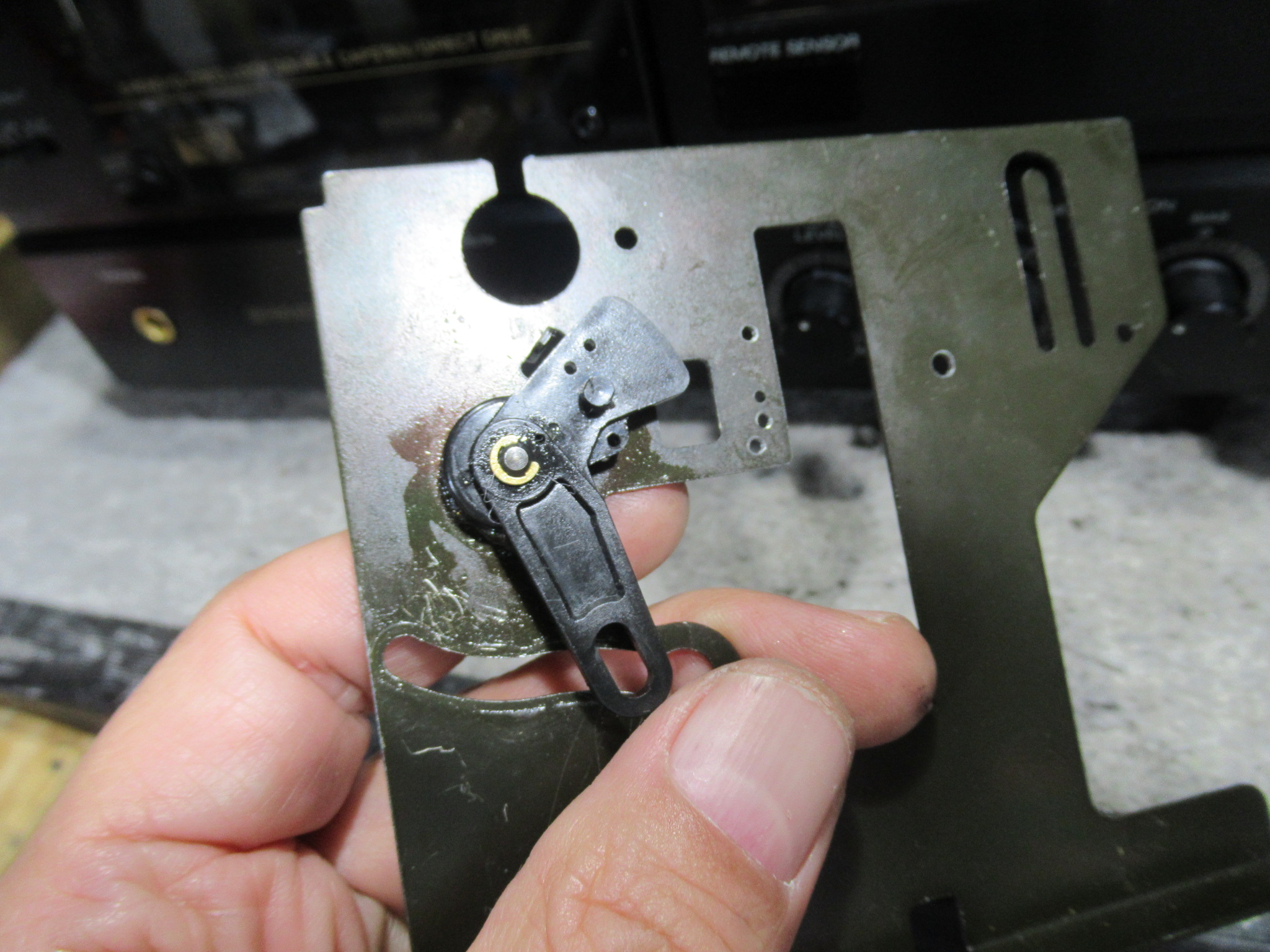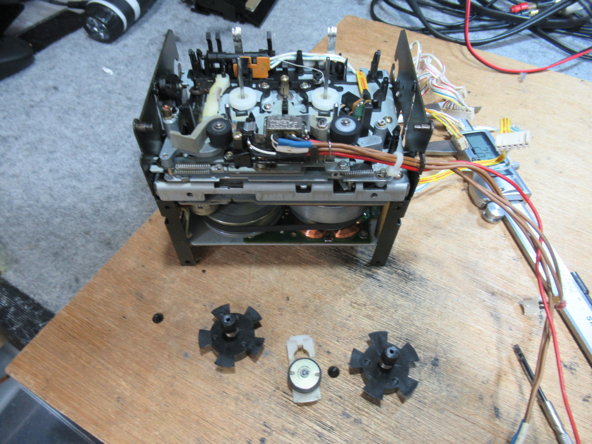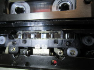 右側のテープガイドが破損しています。これはよく見る光景ですが、ピンチローラーが固着してカセットが閉じ込められた状態で、無理にトレイをこじ開けるとこうなります。部品交換はできませんが、補修は可能ですので、後ほど行います。