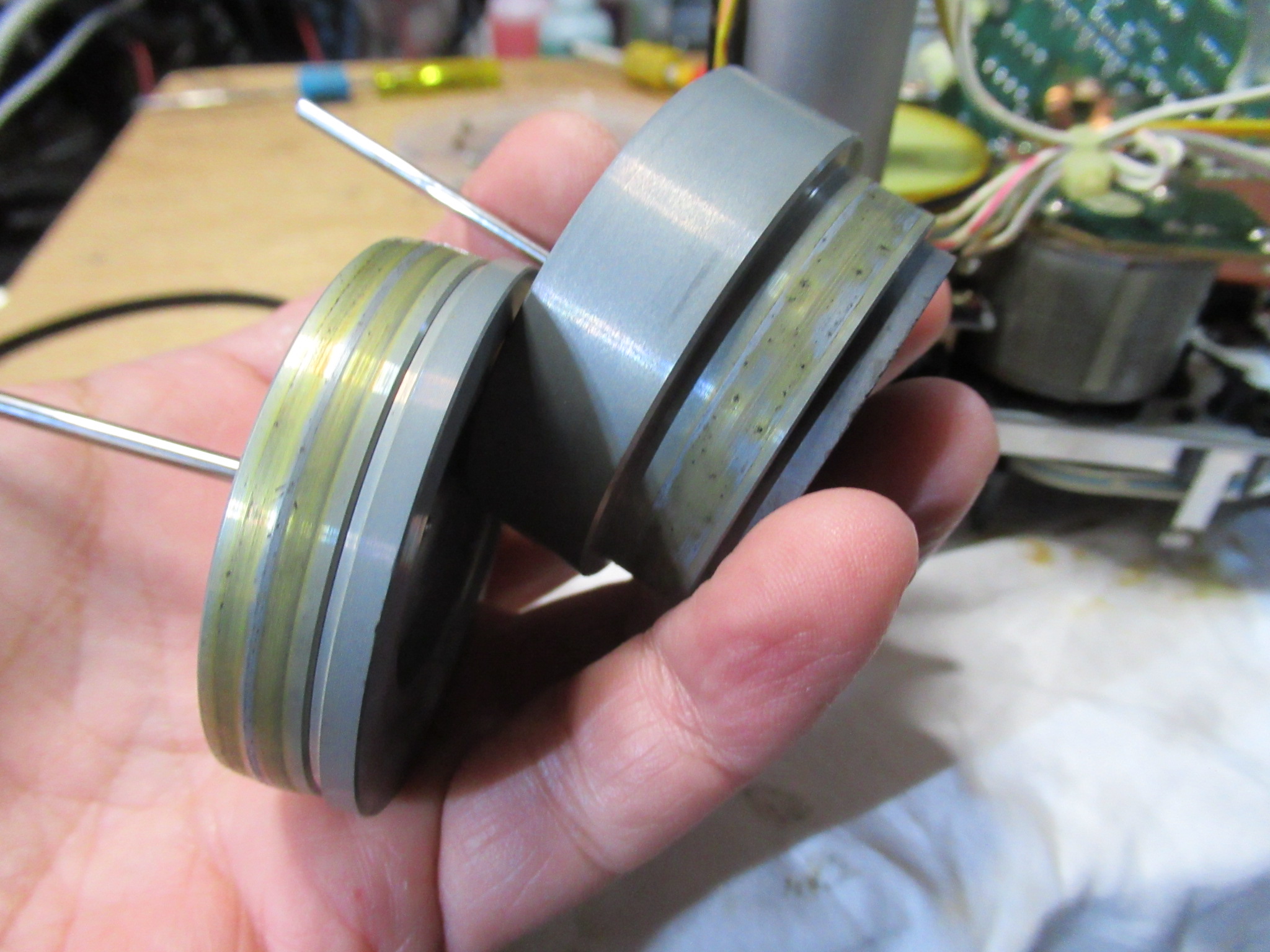 右側のピンチローラーアームを取り外した状況です。グリスが乾いて白くなっています。