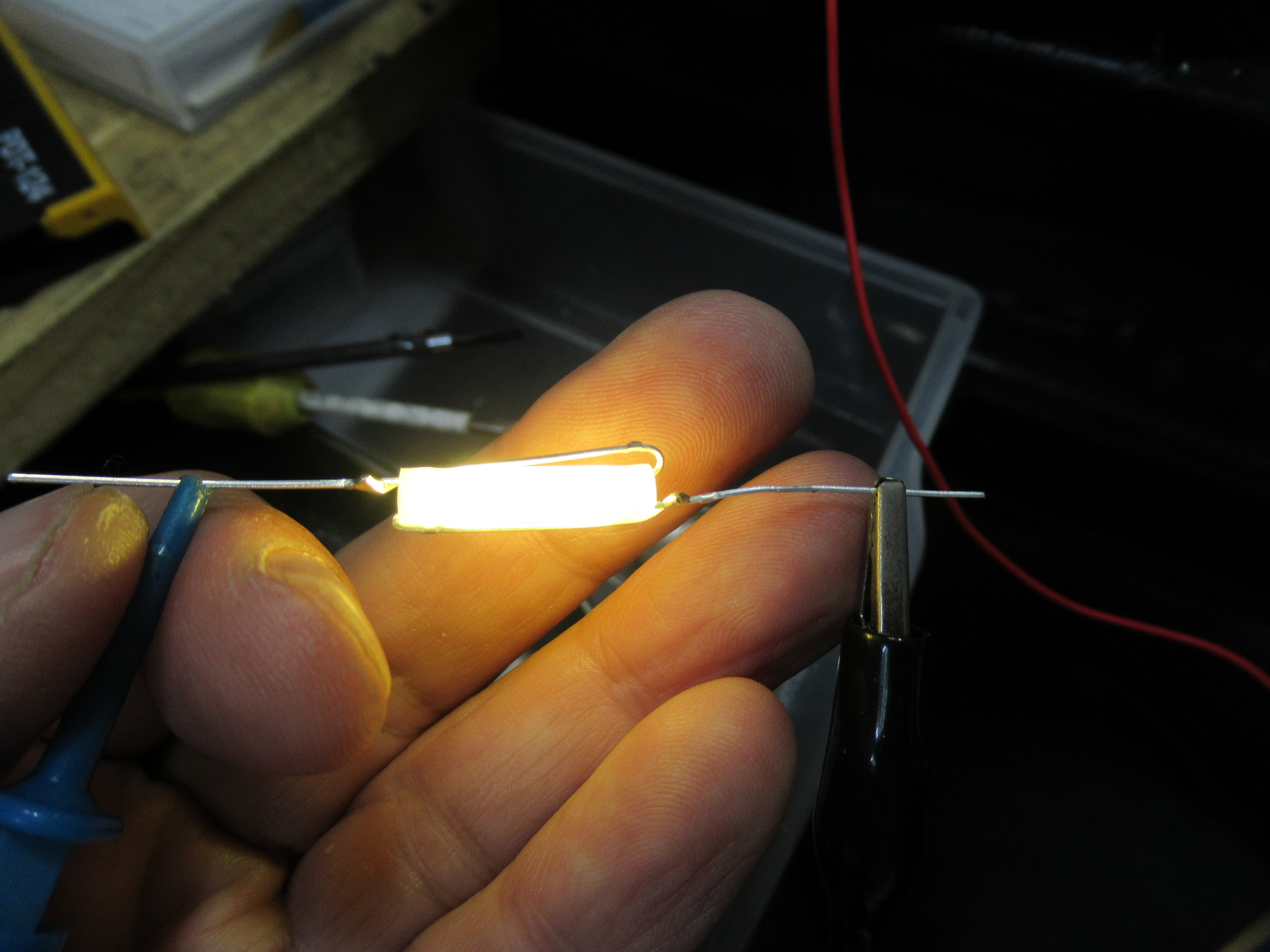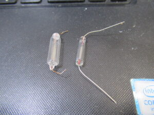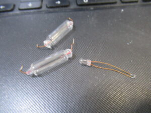 ということで、LED化しますが、電圧や設置スペースに合わせ、加工が必要になります。今回は、一か所あたり2ケの電球色LEDを使用して交流仕様に接続し、光を拡散させるためにストローを短く切ったものを使用します。