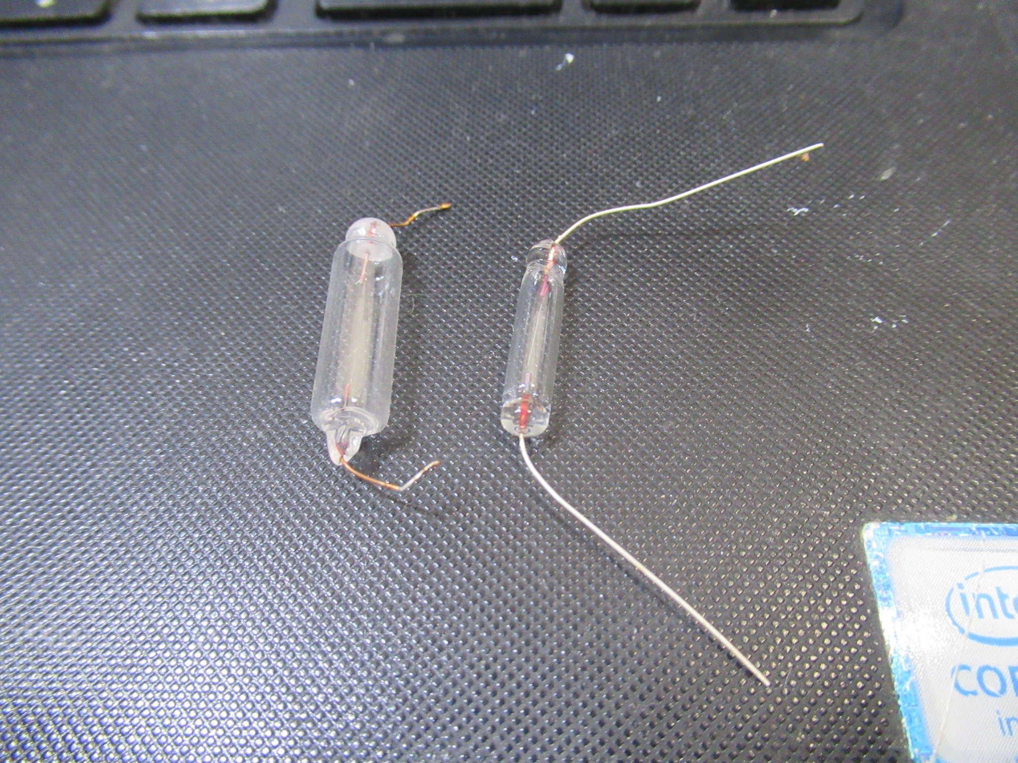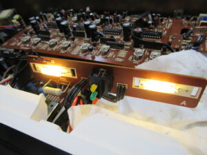 切れていたのは左CHです。あまり見たことの無い大型の電球でしたが、とりあえず手持ちの標準的なランプ(写真右は奥側)と交換しました。しかし、残念ながら、ご覧のとおり右CHのものと比べ、かなり光量が不足しています。