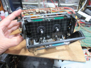 ボタンに反応はありますが、再生できません。早送り巻き戻しはOKですので、どうやらピンチローラーアームが固着しているようです。