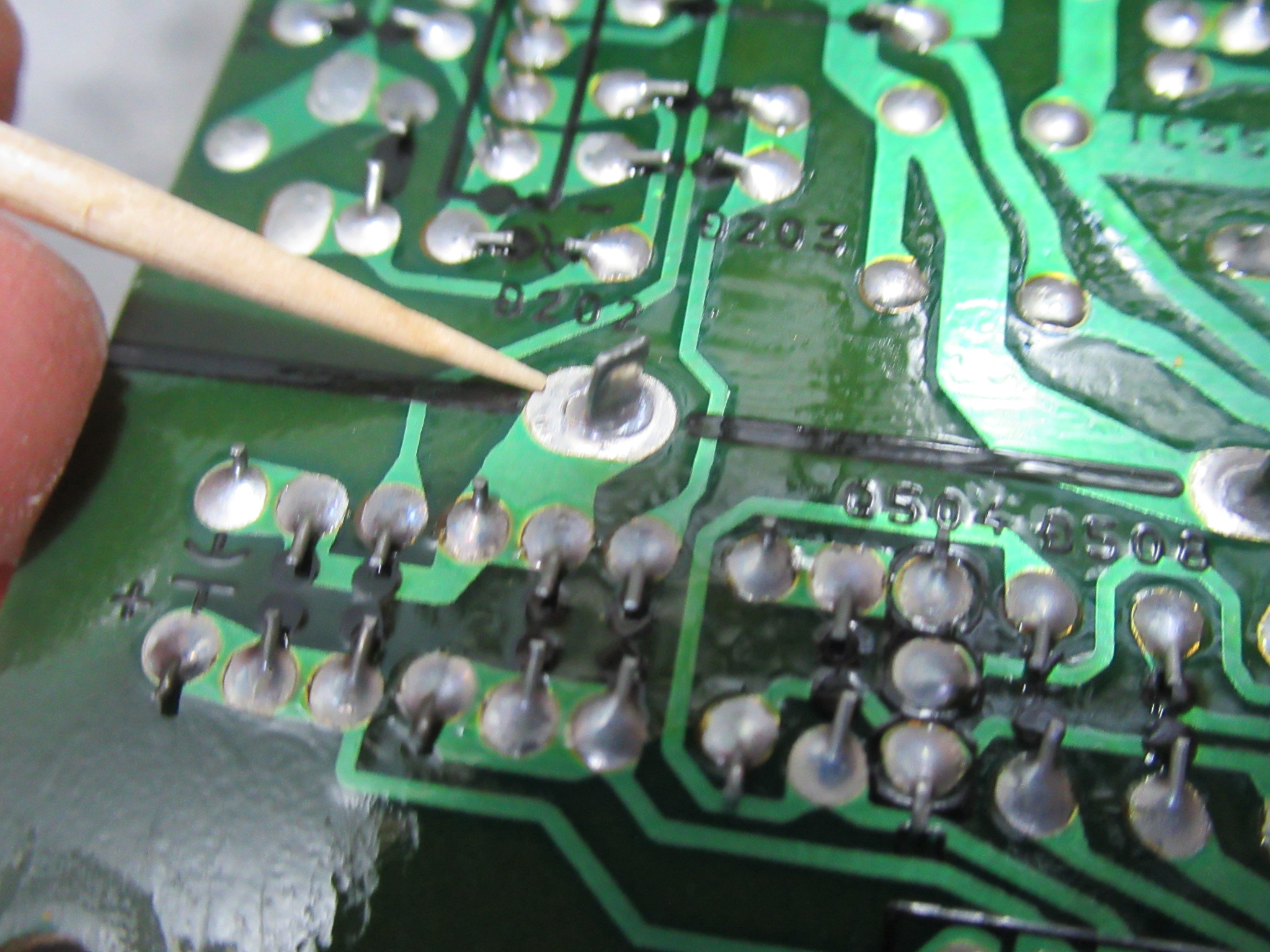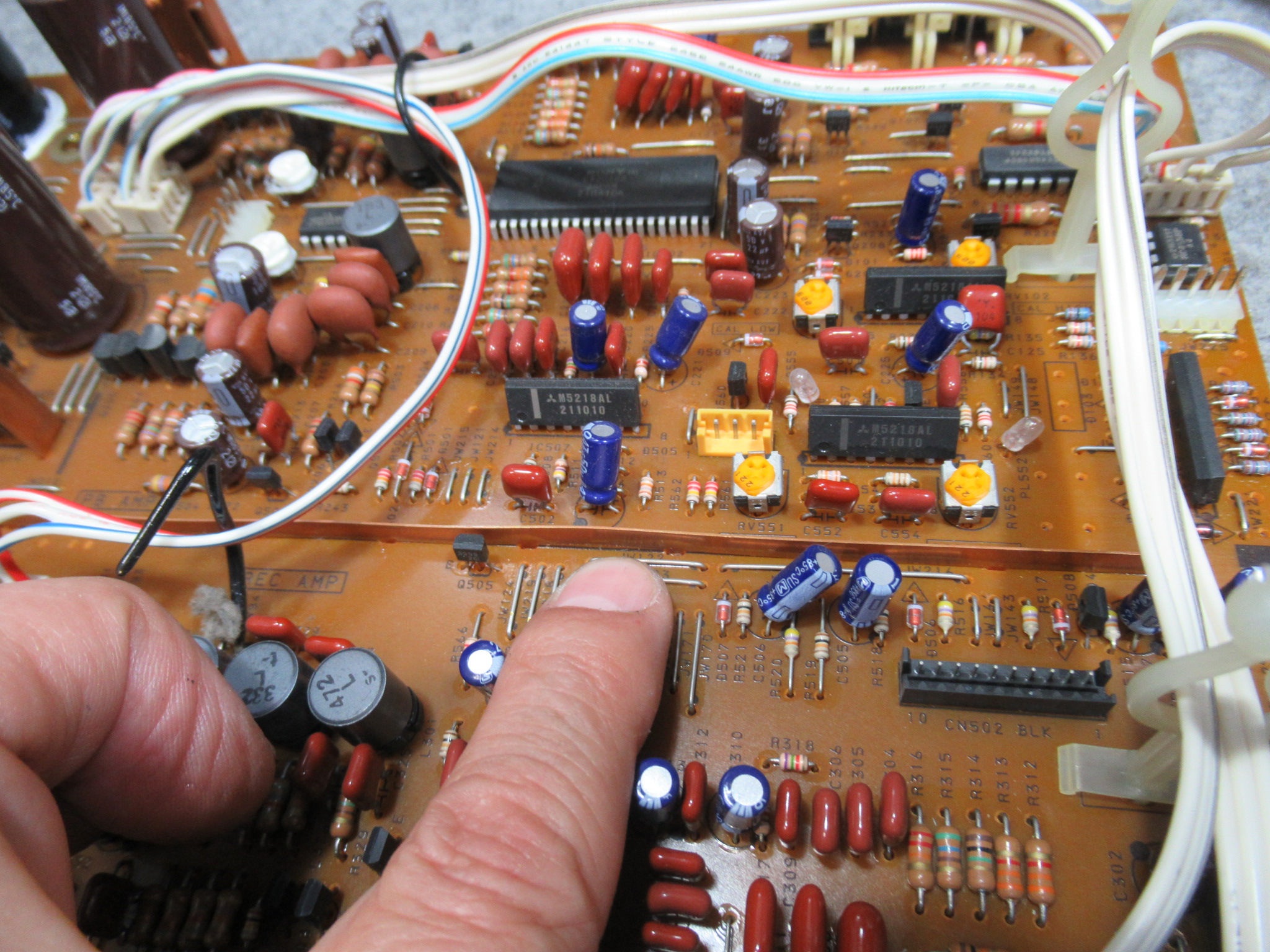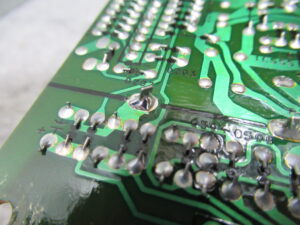 この機種と222ESLには、基板に必ず点検しなければならない箇所があります。指差ししているのは、銅板のアースラインです。