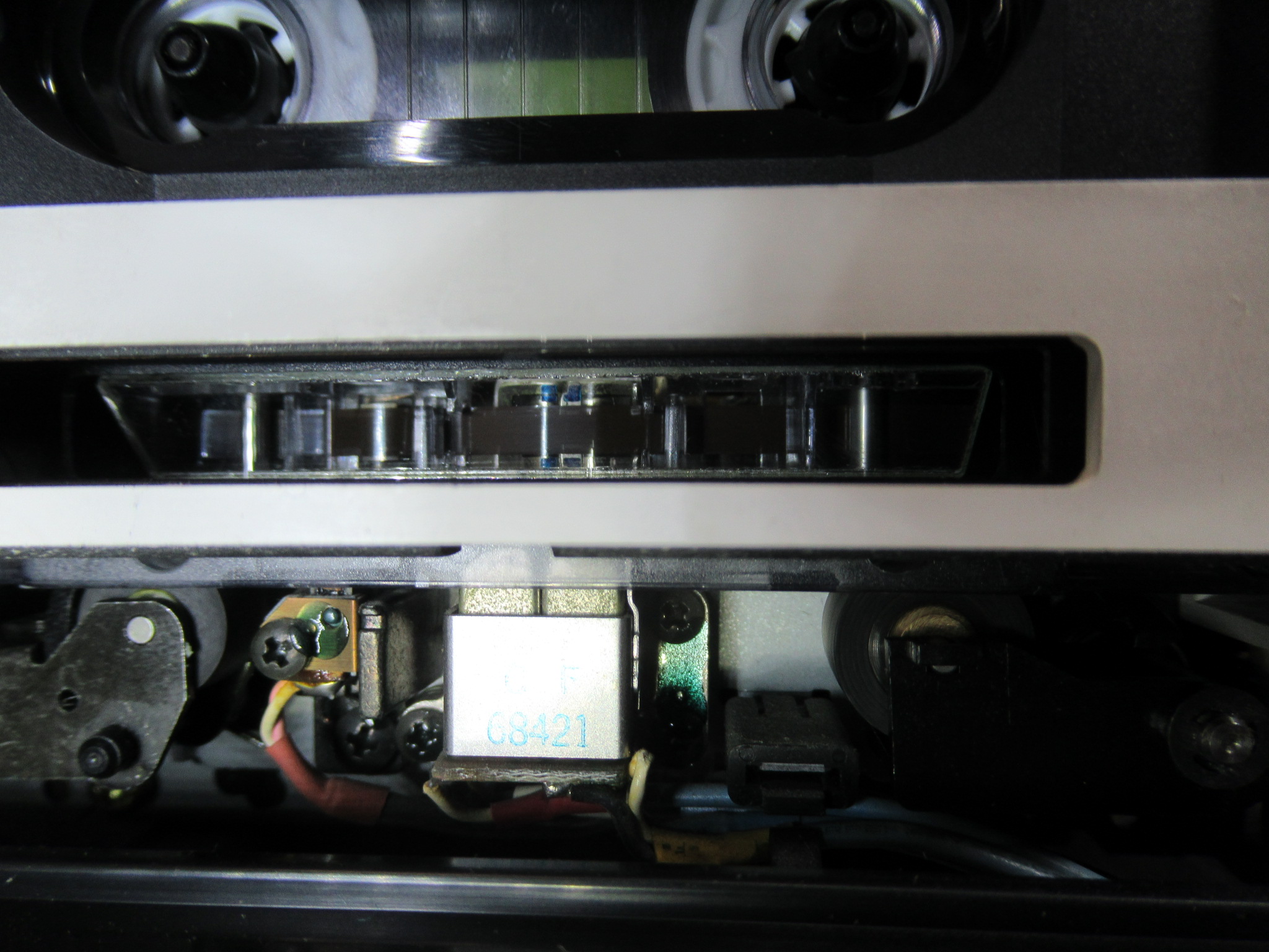 基板を元に戻して点検調整に移ります。ミラーカセットを用いてテープの走行状態を目視点検します。