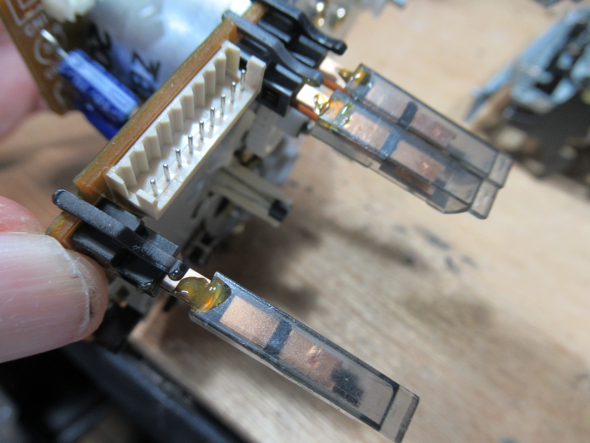 オートセレクタ用のスイッチ接点のメンテナンスを行おうとしましたが、カバーがすべて接着固定されています。おそらく前回の修理で固定するツメ部分を破損したためと思われます。このカバーの脱着にはコツが必要です。