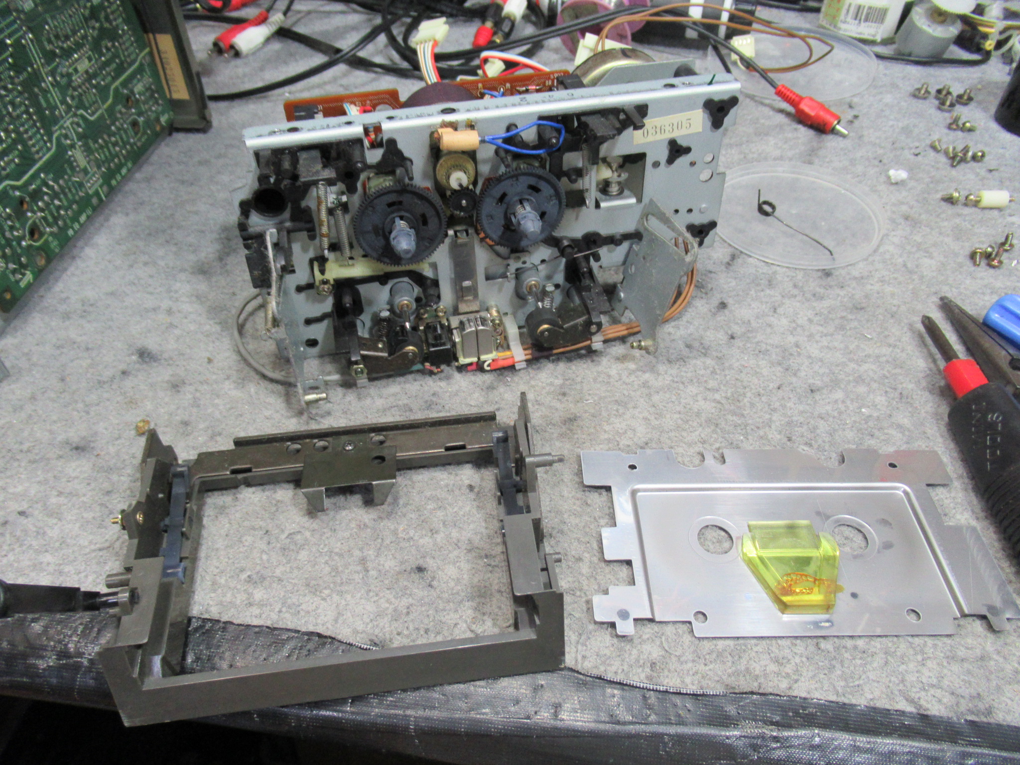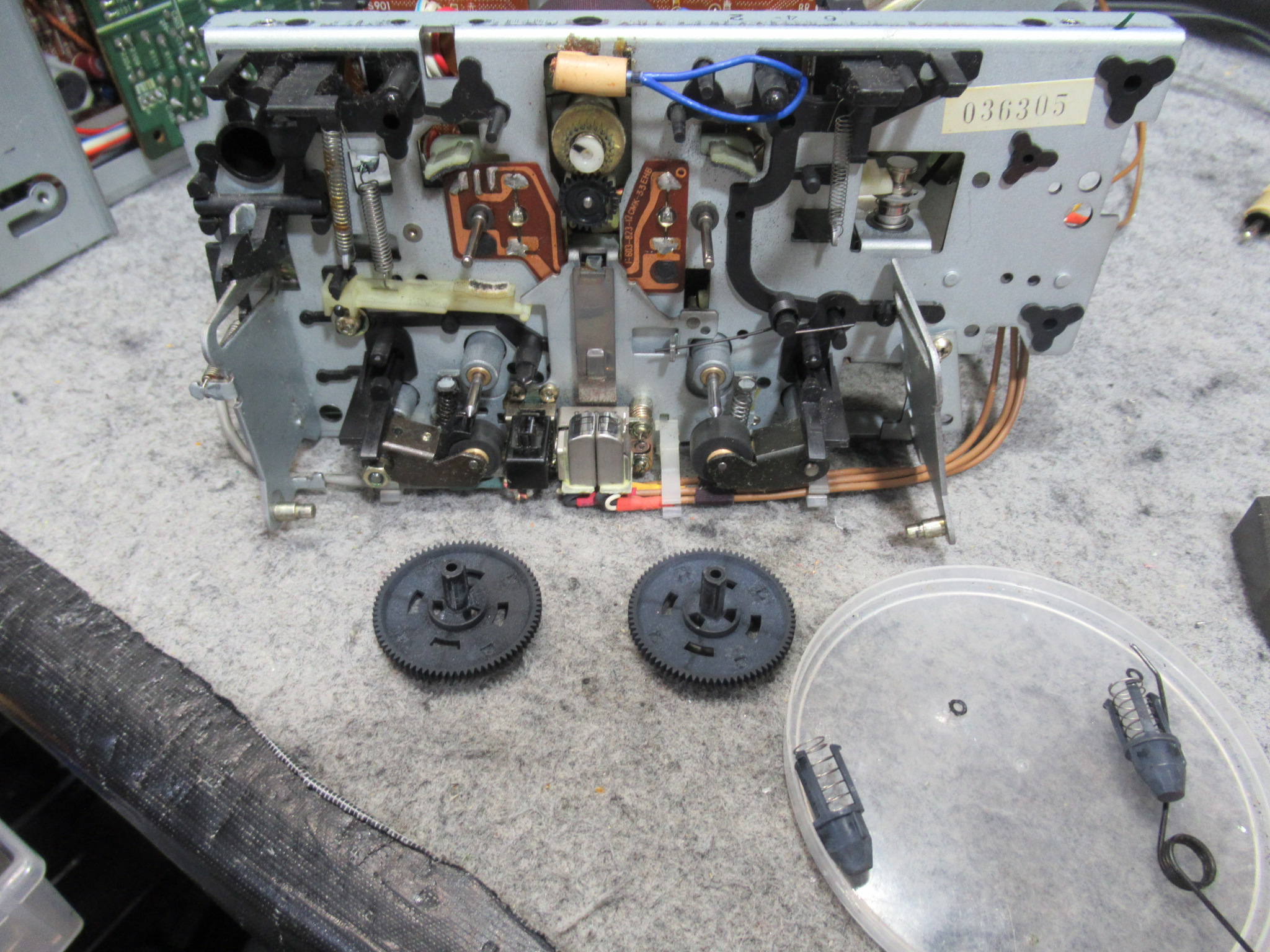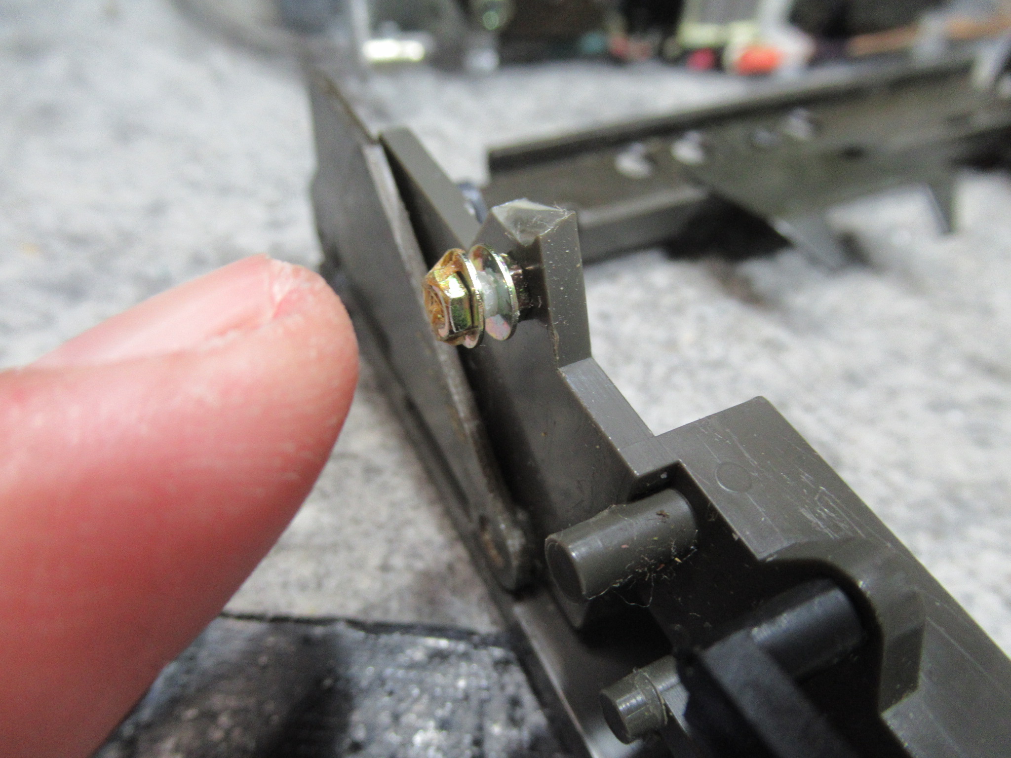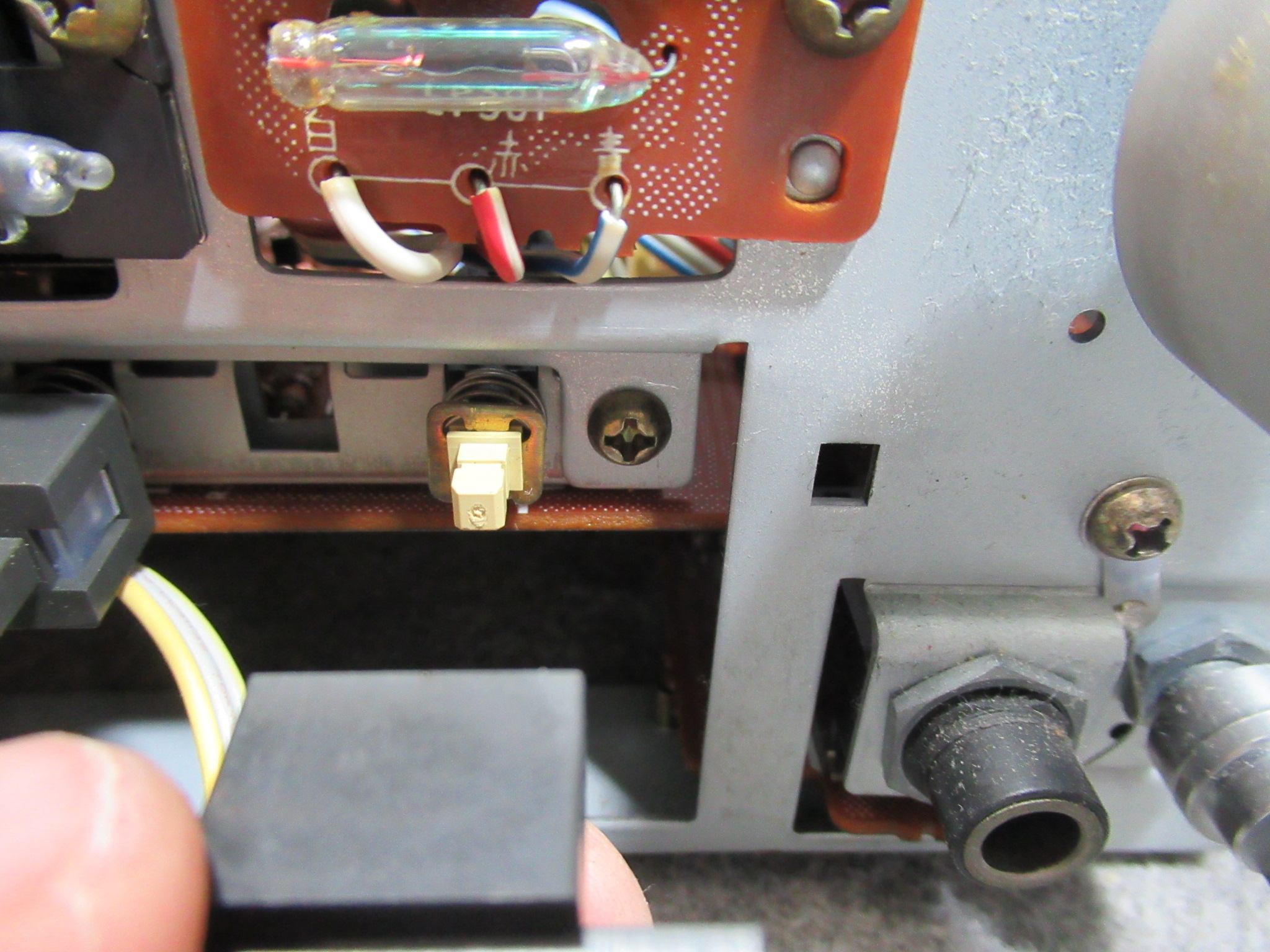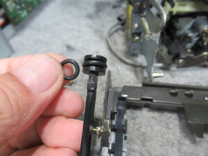 トレイを開くためのバネを受ける箇所が補修されています。説明は難しいのですが、ピンが台座ごと破損したため、元の位置より手前側に取り付けられています。そのため、バネがリッド(蓋)と干渉し、バネが外れてしまったようです。この点については、バネがリッドに接触しないよう加工しました。