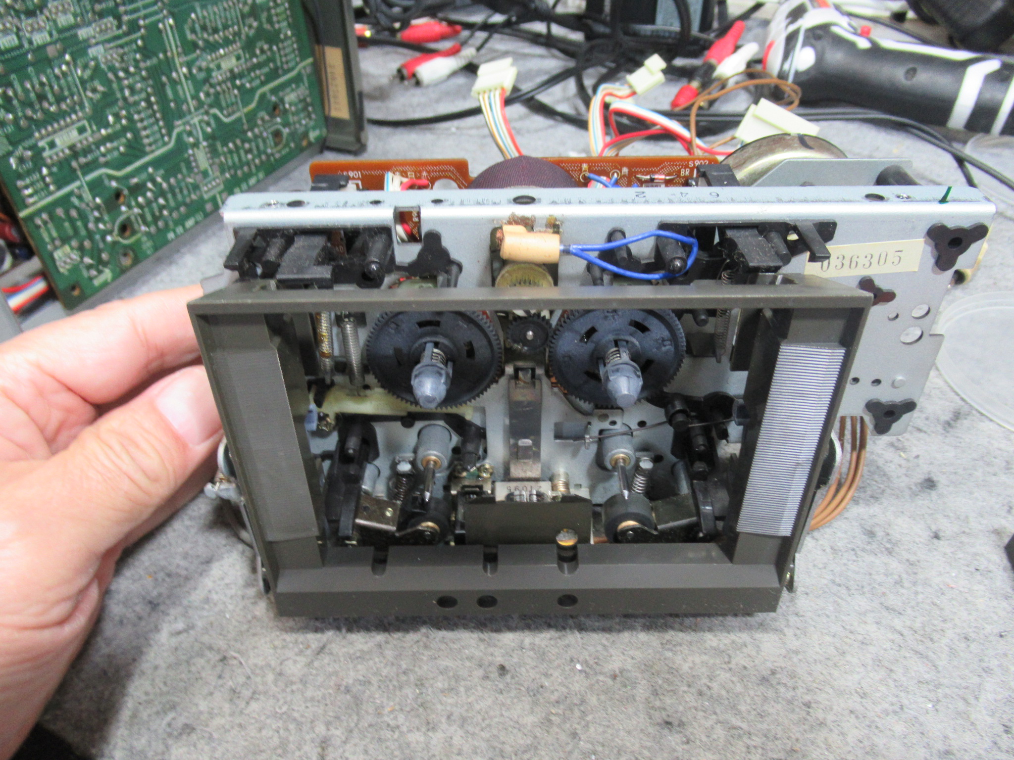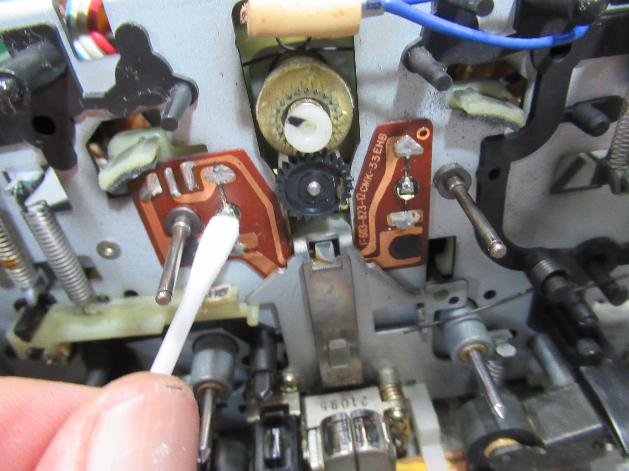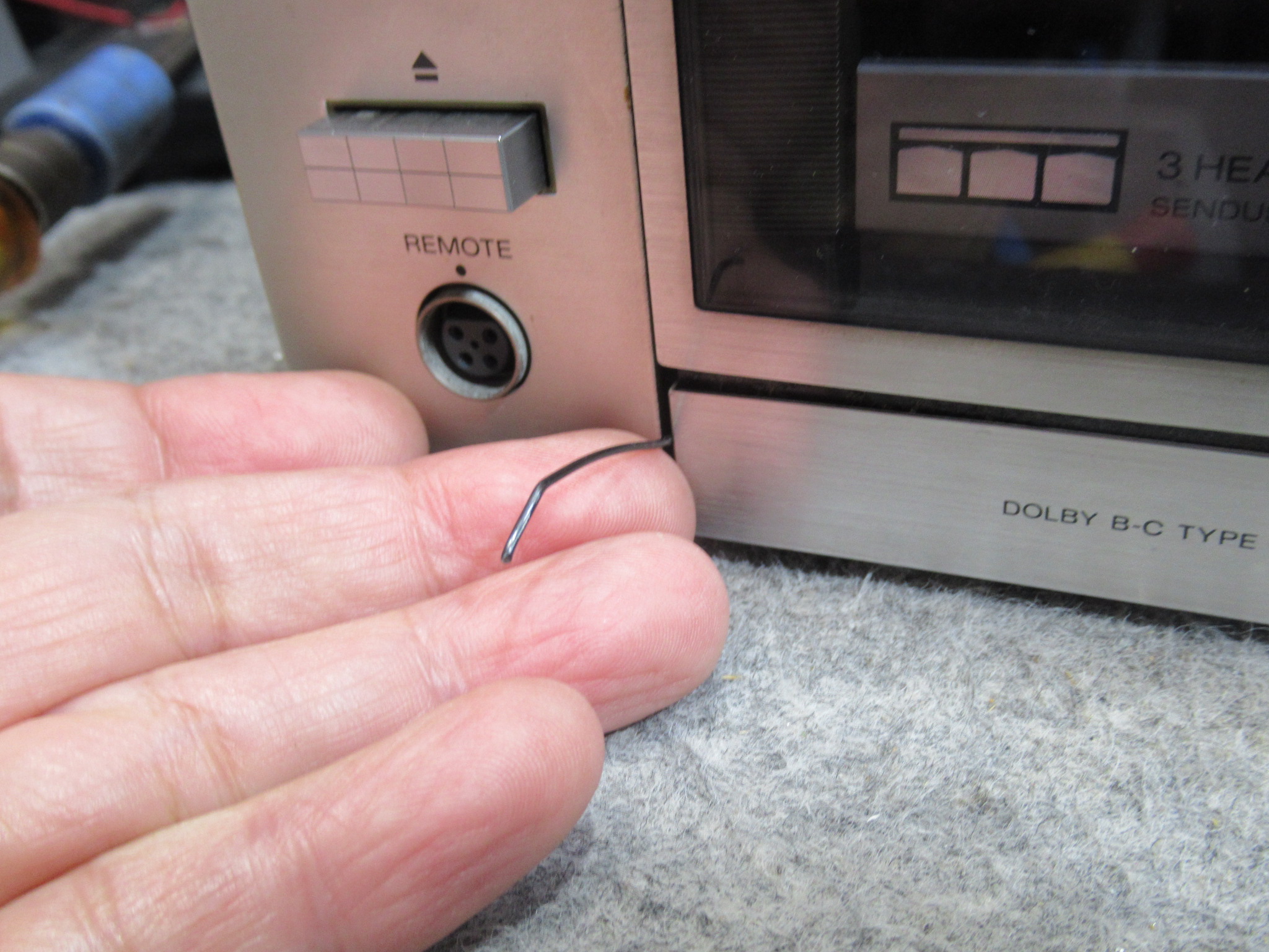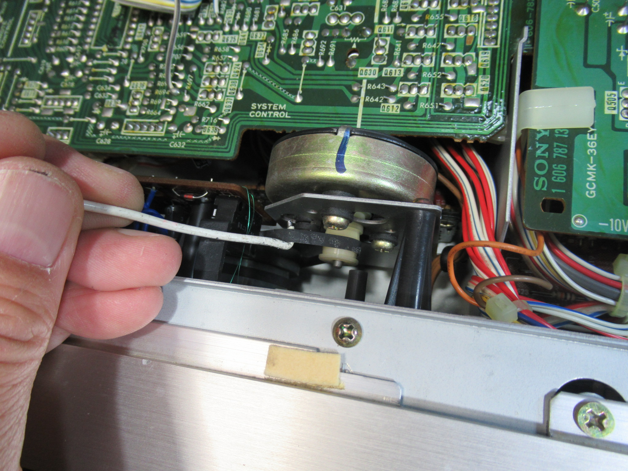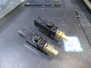 トレイを開くためのバネを受ける箇所が補修されています。説明は難しいのですが、ピンが台座ごと破損したため、元の位置より手前側に取り付けられています。そのため、バネがリッド(蓋)と干渉し、バネが外れてしまったようです。この点については、バネがリッドに接触しないよう加工しました。