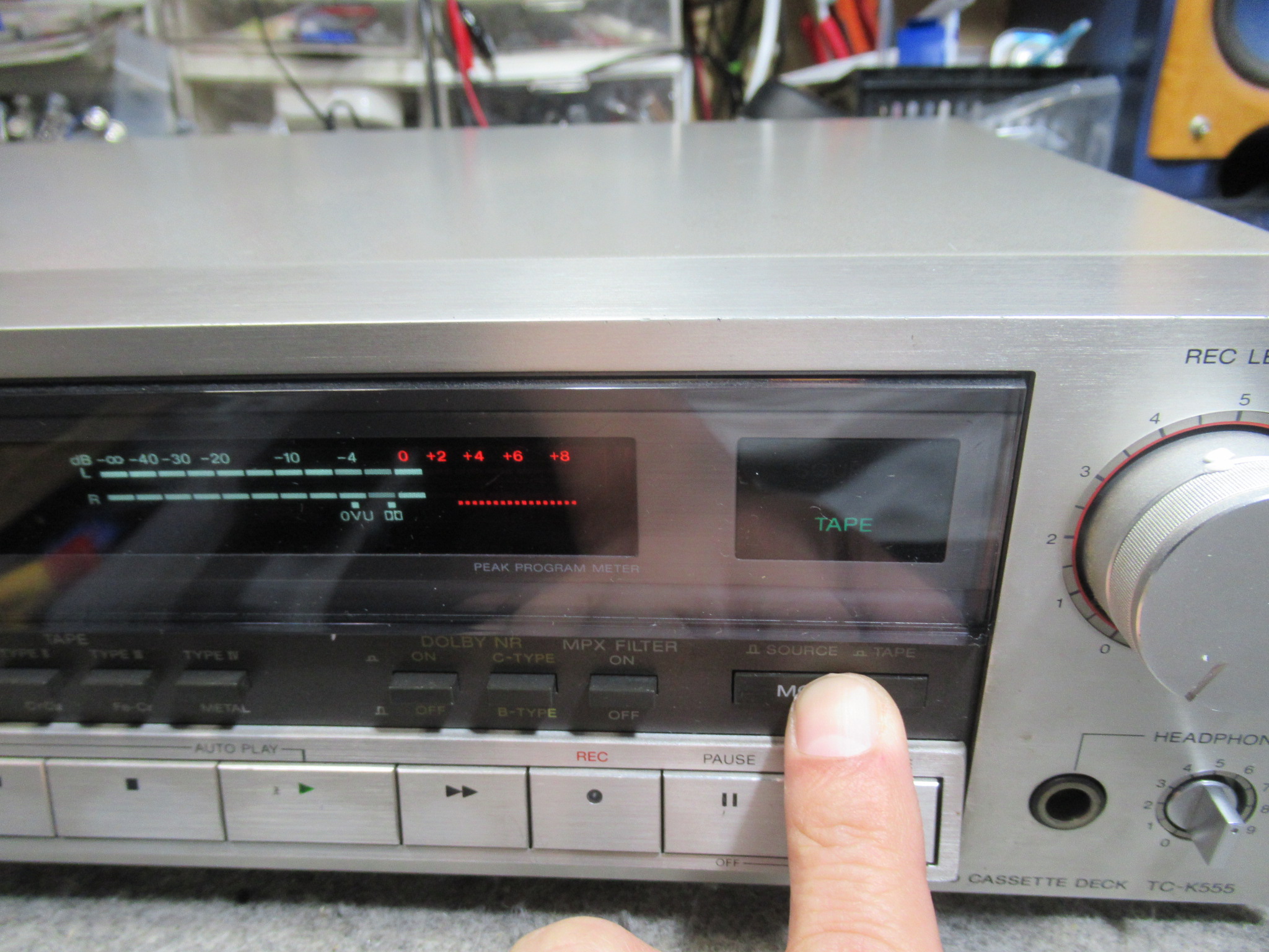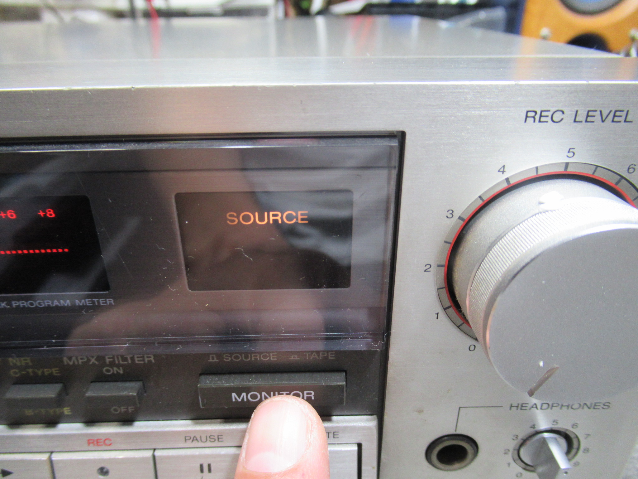 モニター切替スイッチは、常時「SOURCE」状態で、ボタンを押したままでないと「TAPE」になりません。