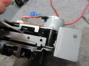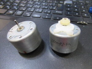 リールモーターを交換します。6Vで約1400rpmという規格ですので、手持ちの在庫品から類似規格のものと交換します。このギヤは、シャフト部がひび割れがしやすいので、取り付け時は接着剤を処置する必要があります。