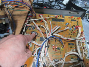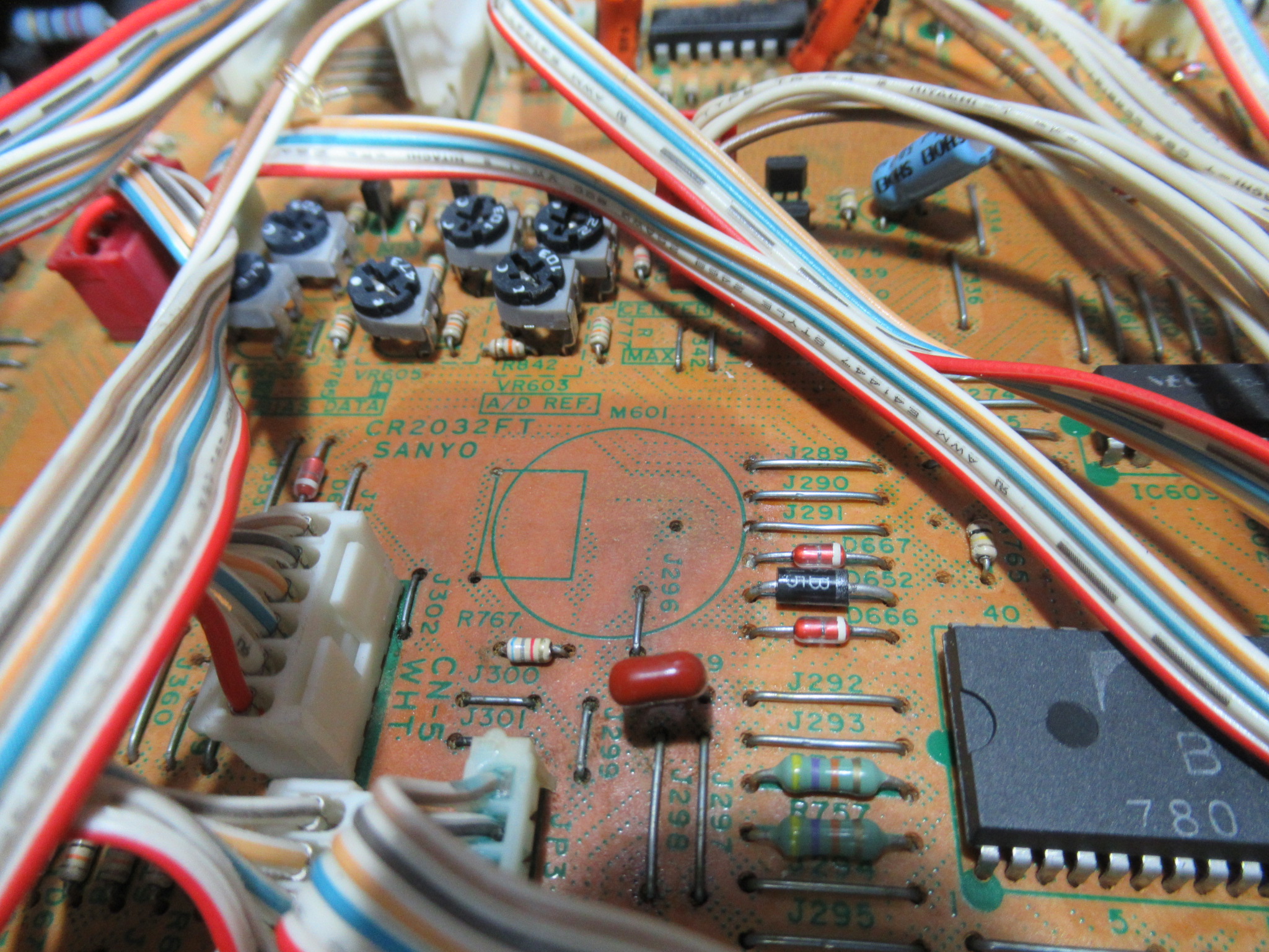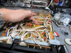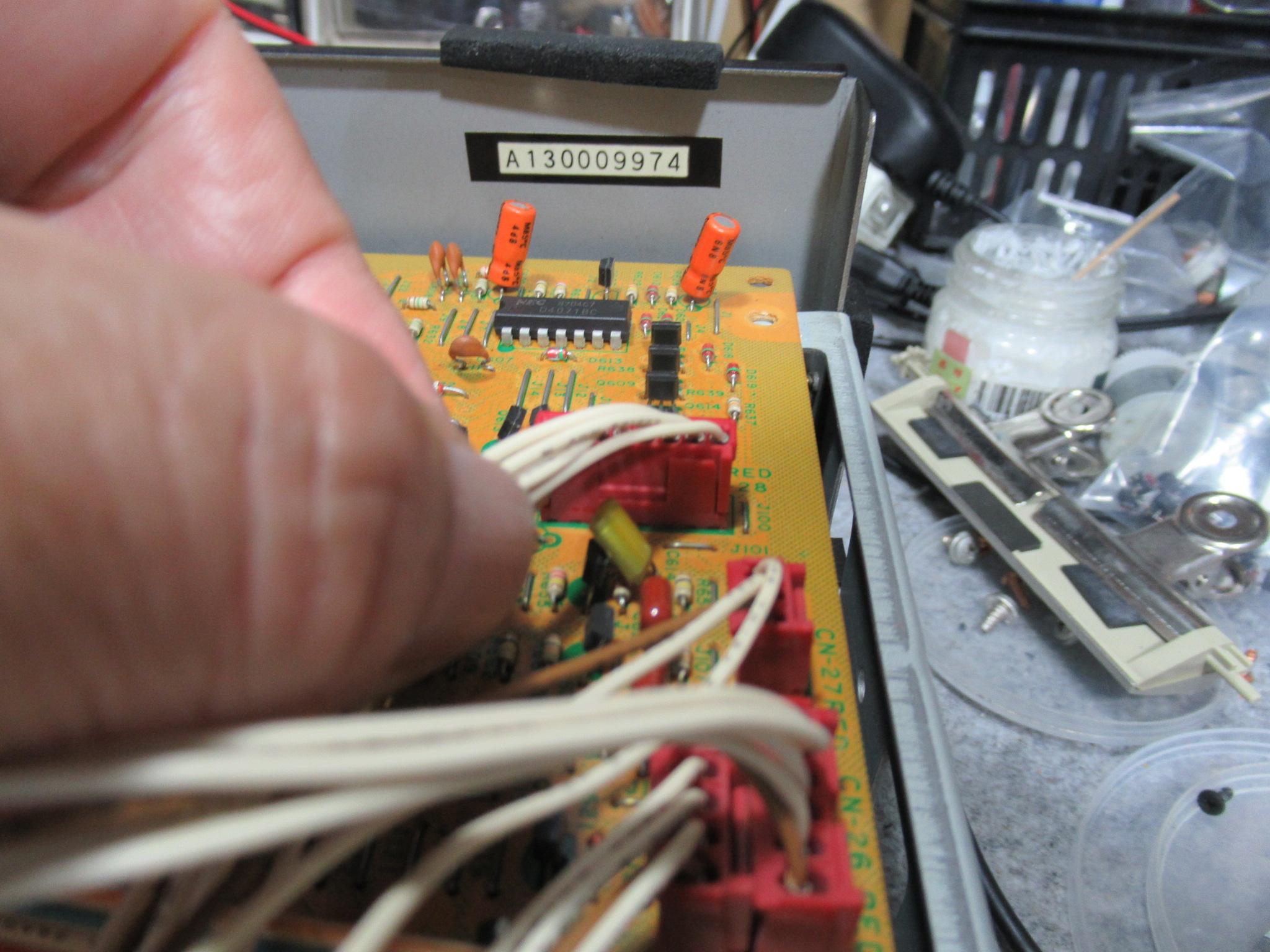 消灯していたランプが点灯し、動作するようになりました。ということは、どこかに接触不良が起きているということになります。そこで、コネクタを揺すったり、基板を指で押したりすると、先ほどのSTOPランプが一瞬暗くなりました。