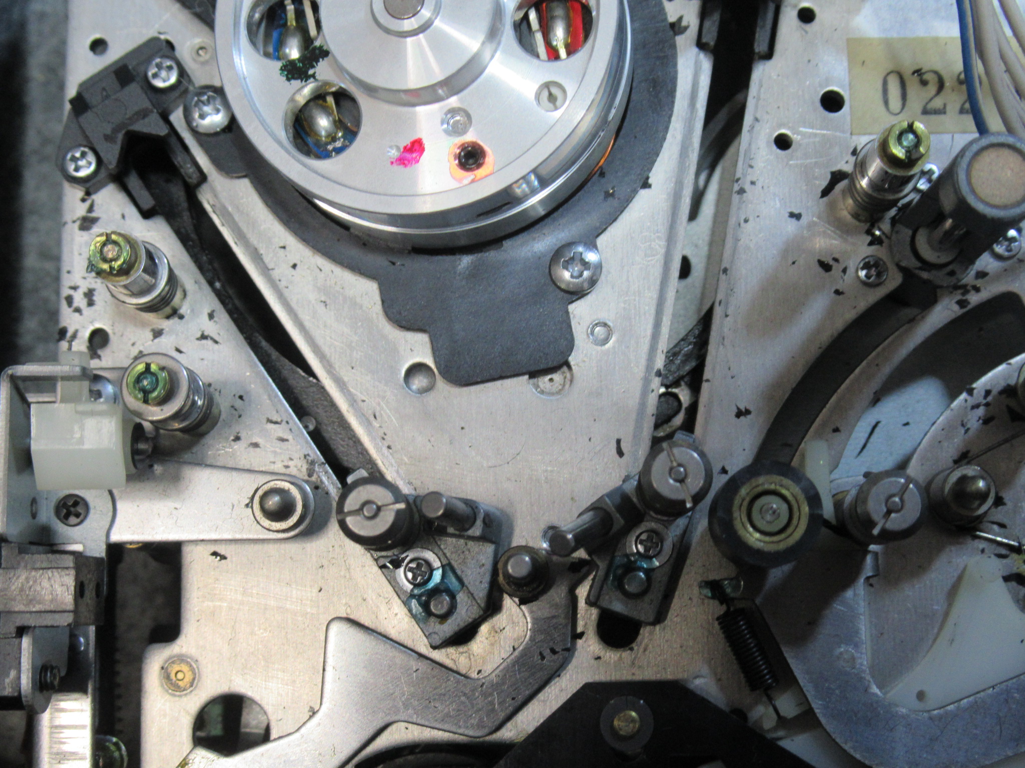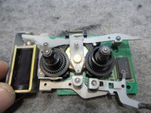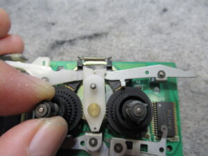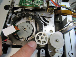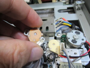 右側のテープガイドが左に比べて少し上がっています。メカの裏側のギヤを脱着して調整を行います。