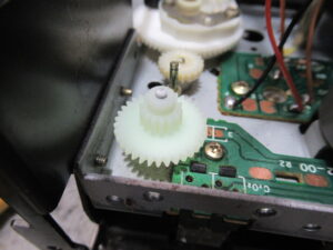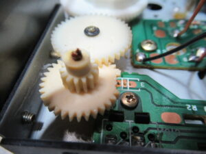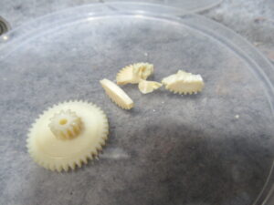 シャフト部のグリスが固まっていてバラバラになってしまいました。このギヤが欠ける原因は、プラスチックの劣化とグリス硬化です。