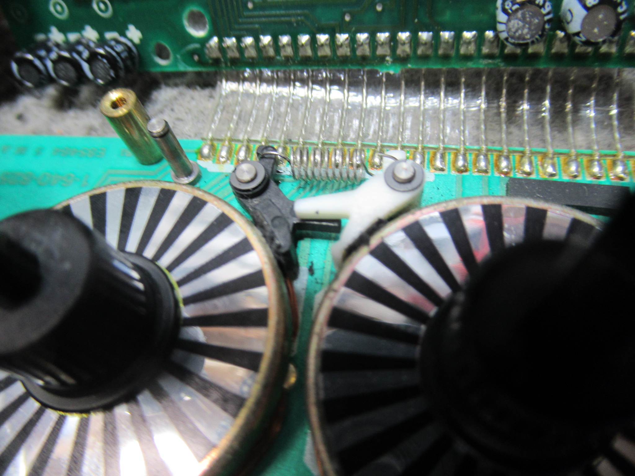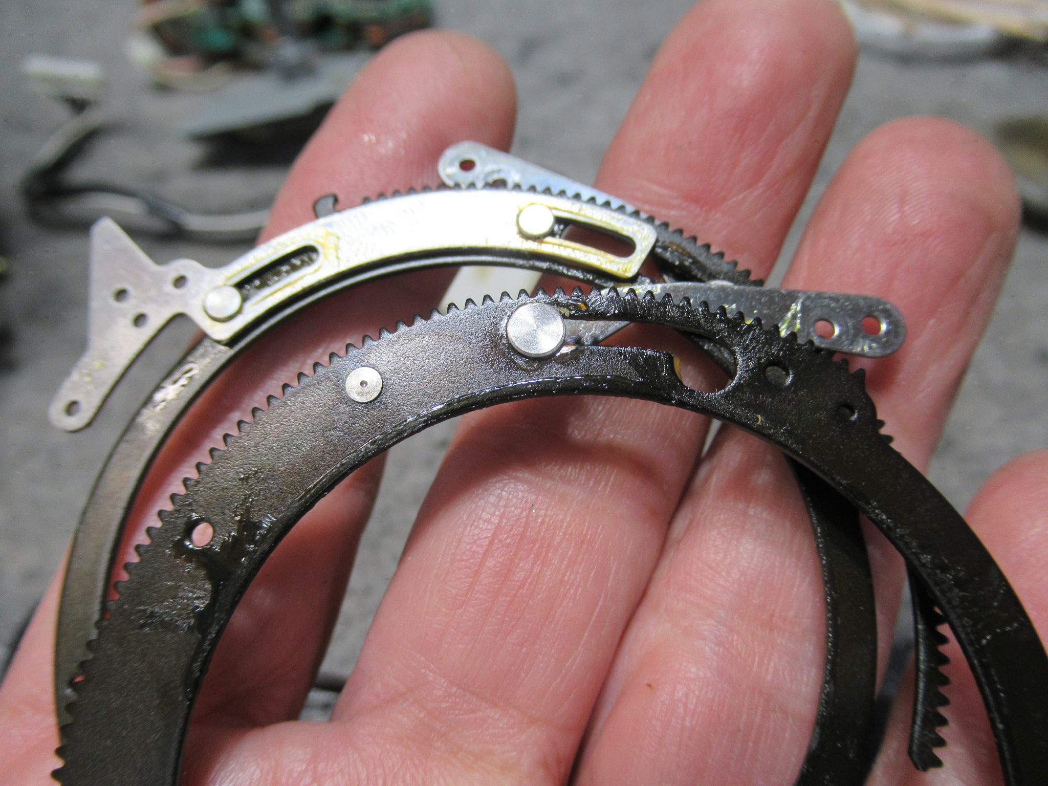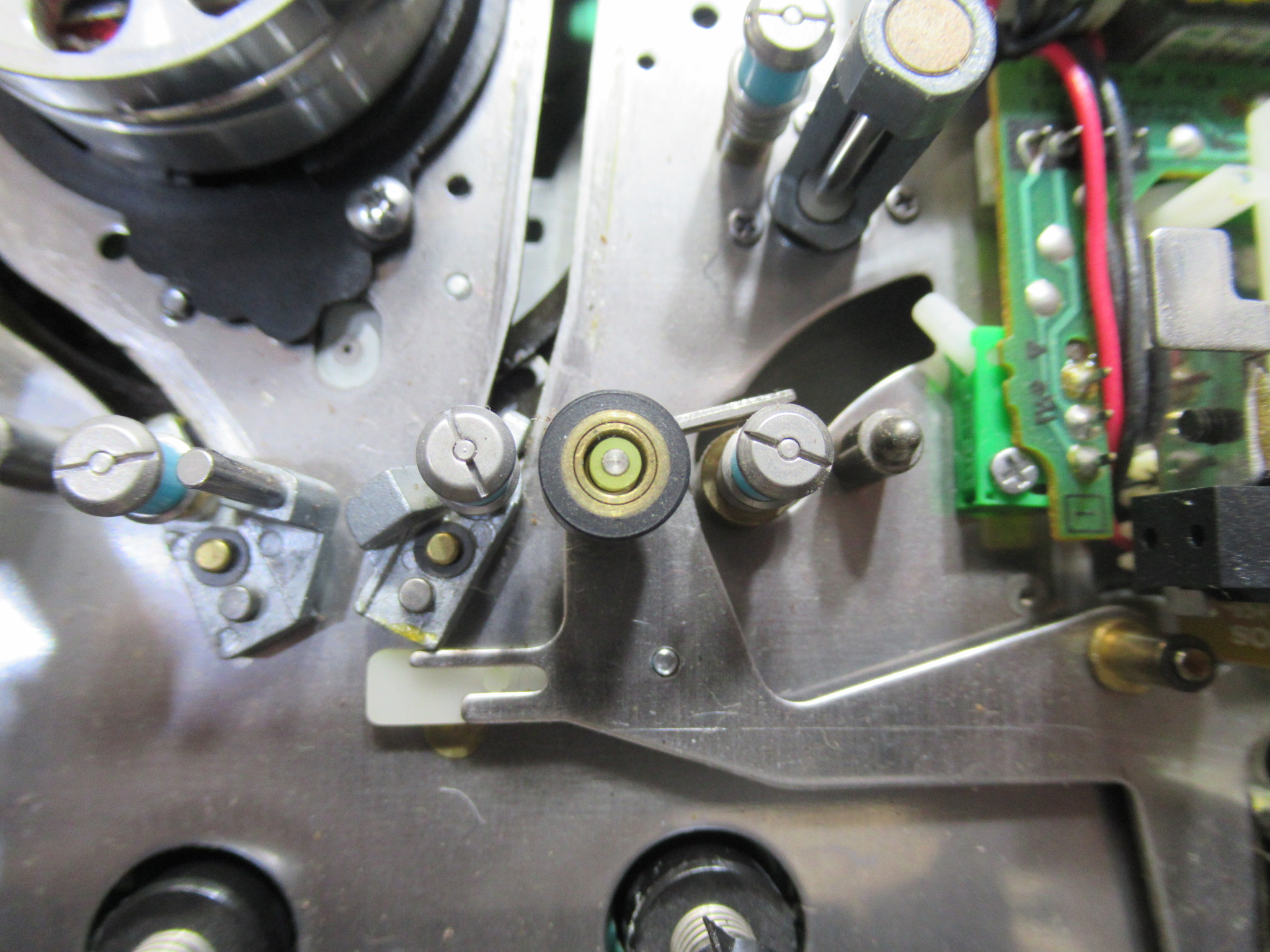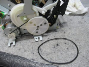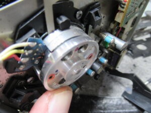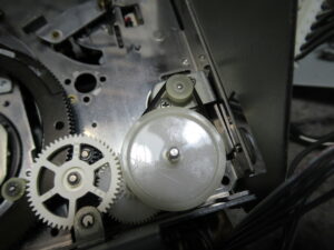 可動式のテープガイドを駆動するリングギヤです。製造時に塗られたと思われるグリスが固まって可動部が固着していましたので、CRC清掃し注油します。
