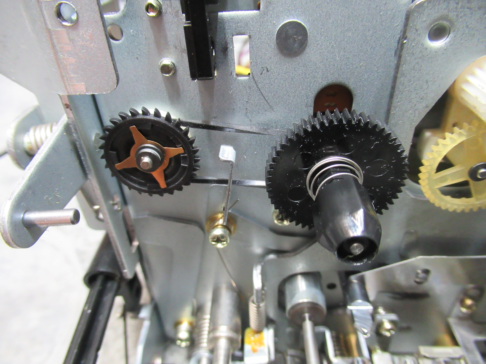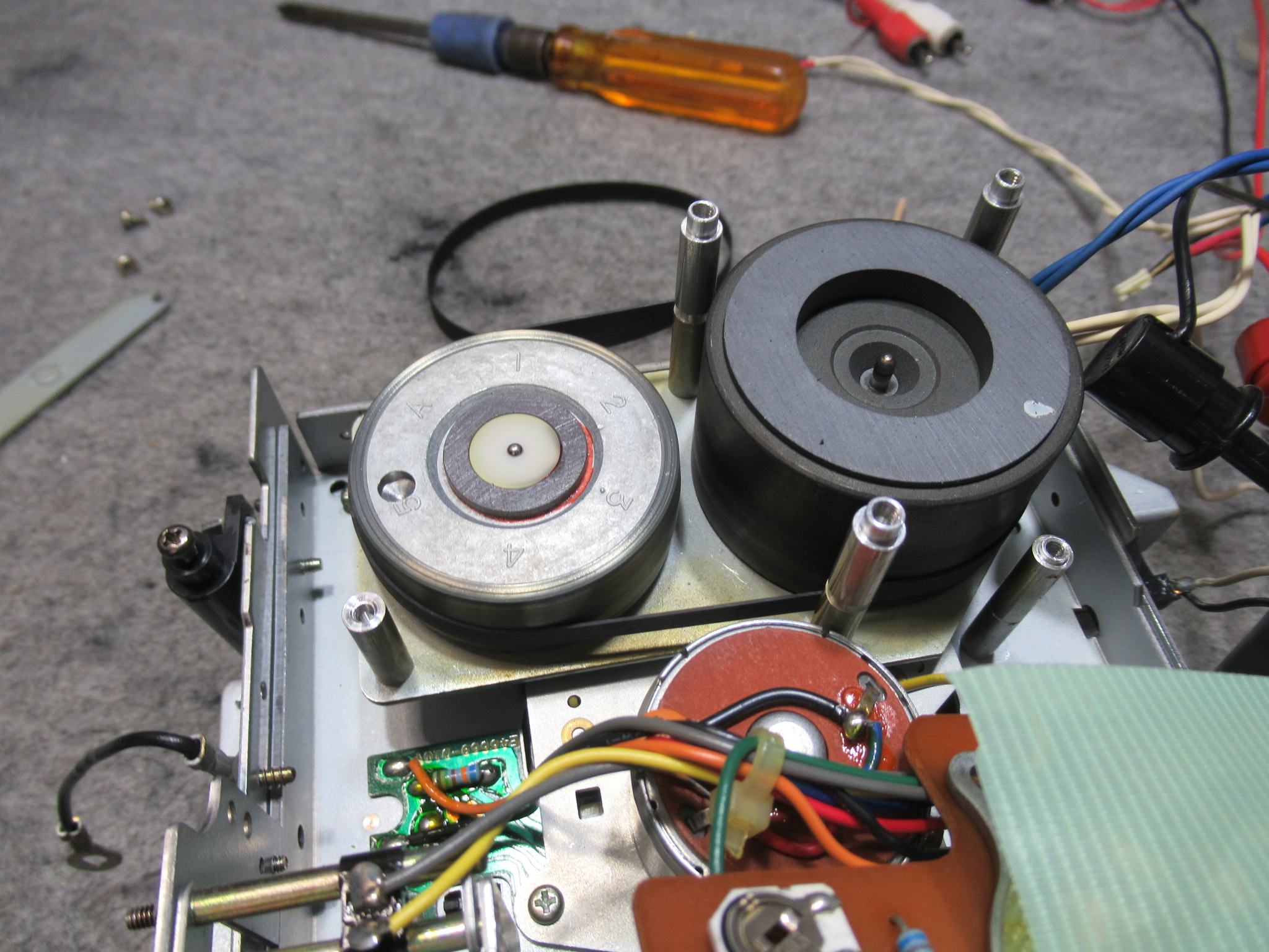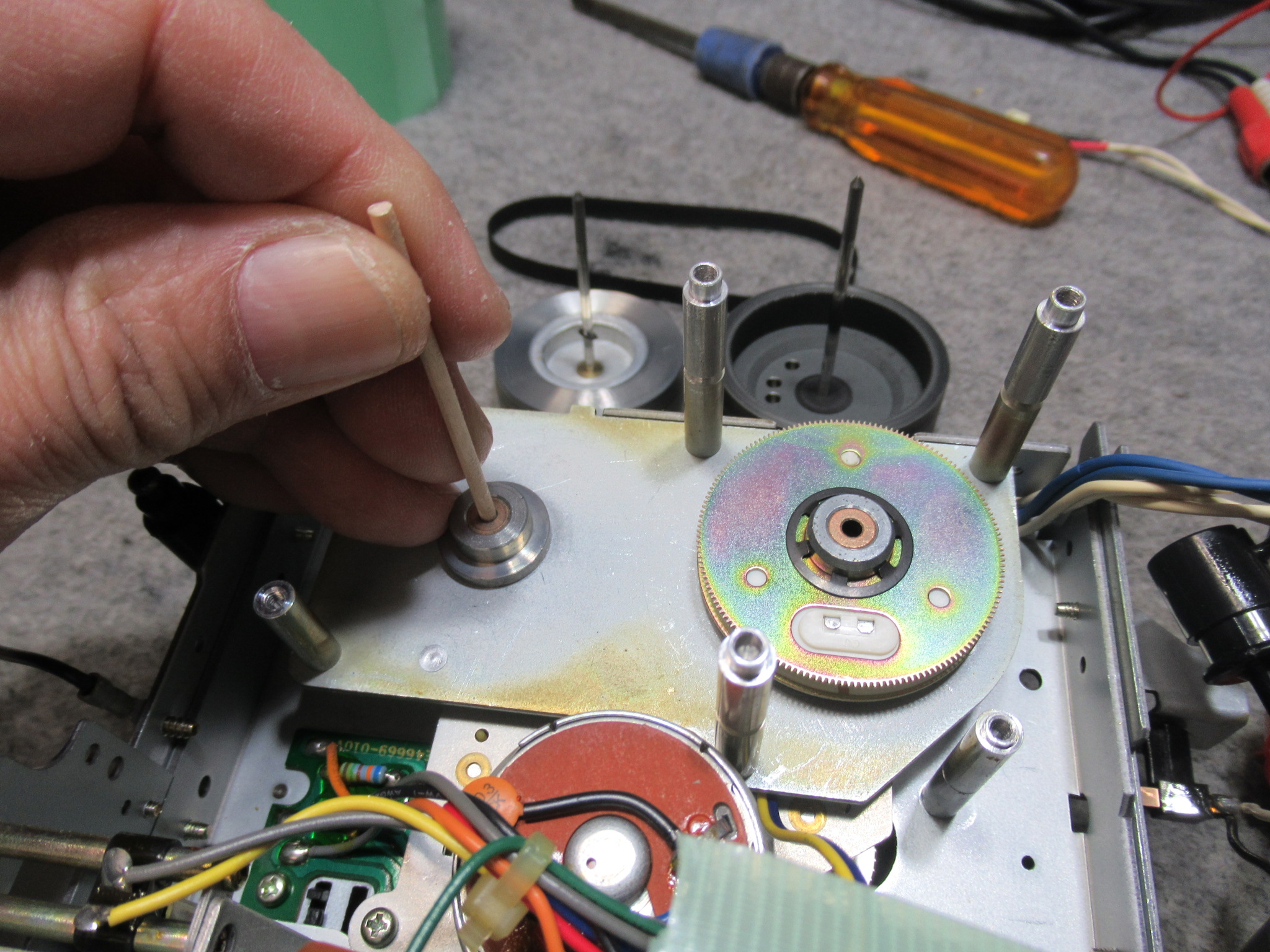 キャプスタンの貫通部を清掃して注油し、新しいベルトを掛けて組み付けます。