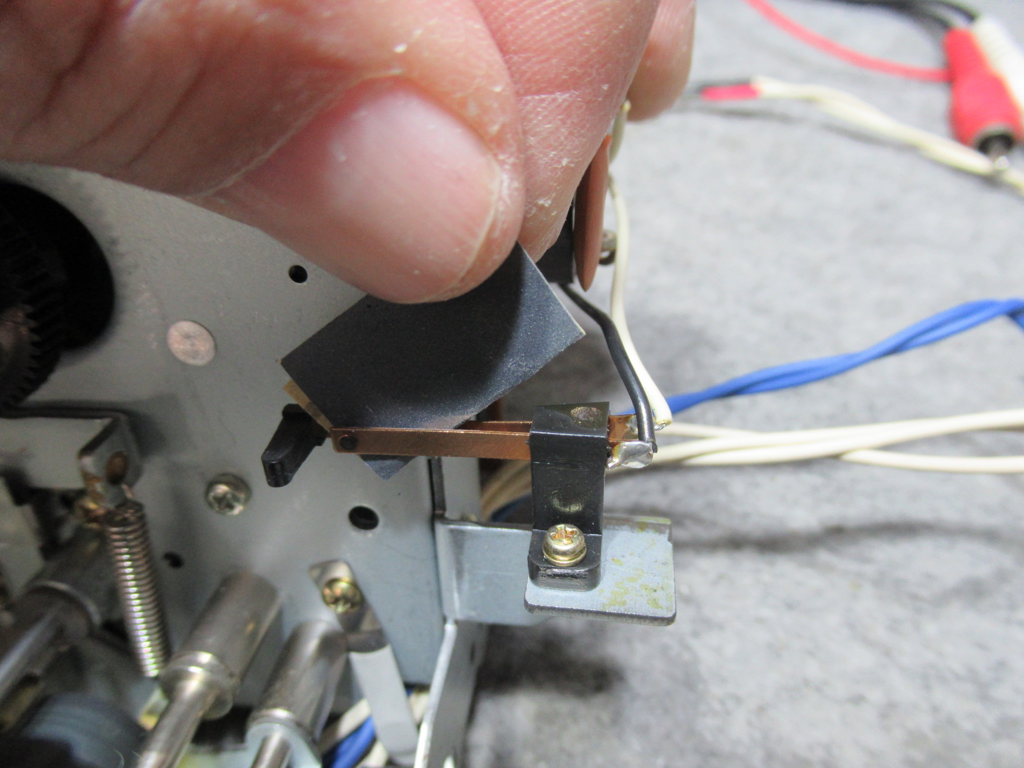 トレイ開閉を検知するスイッチ接点を磨きます。