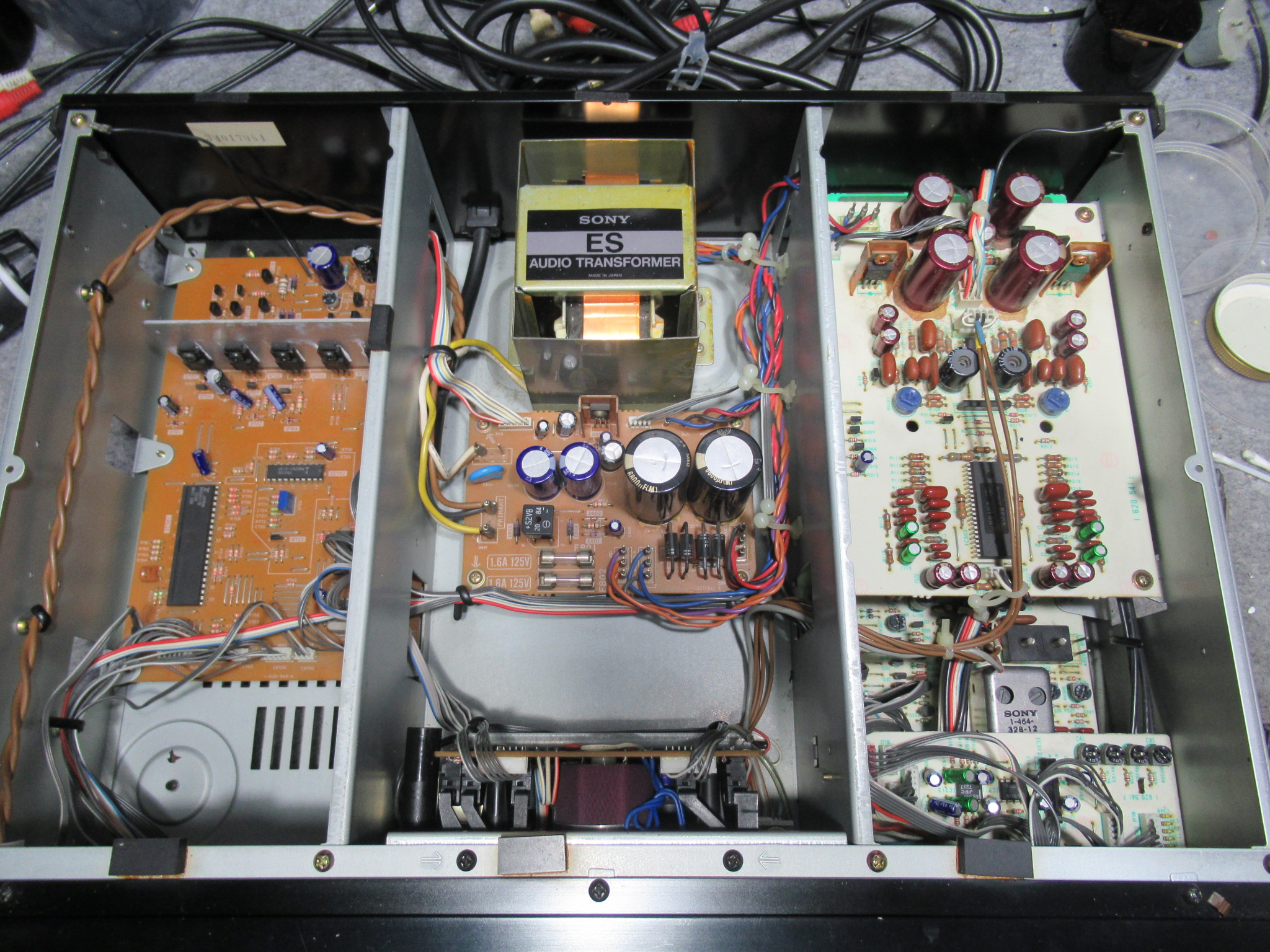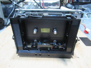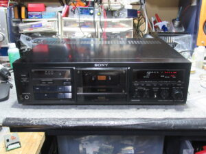 SONYの3ヘッドデュアルキャプスタンカセットデッキ、TC-K555ESXの修理依頼をいただきました。 再生・早送り・巻き戻し、すべて開始後数秒で停止するということです。 ヘッドホンジャック修理の形跡 …
