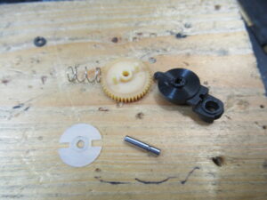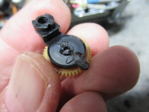ギヤを固定しているシャフトが抜け出しています。ひび割れ部を接着した形跡がありましたので、以前の修理で処置されたと思われますが、不完全だったようです。