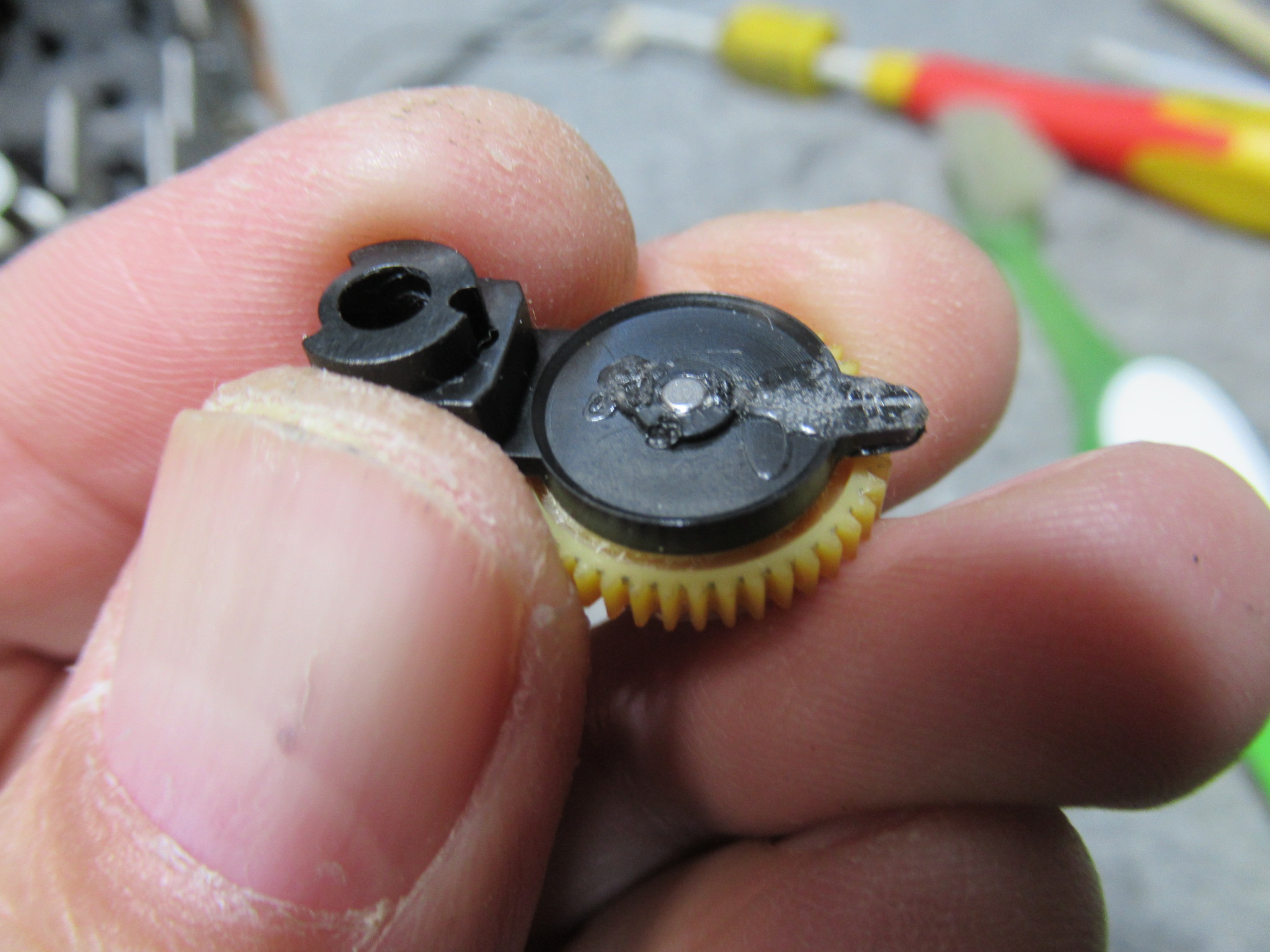 ギヤを固定しているシャフトが抜け出しています。ひび割れ部を接着した形跡がありましたので、以前の修理で処置されたと思われますが、不完全だったようです。