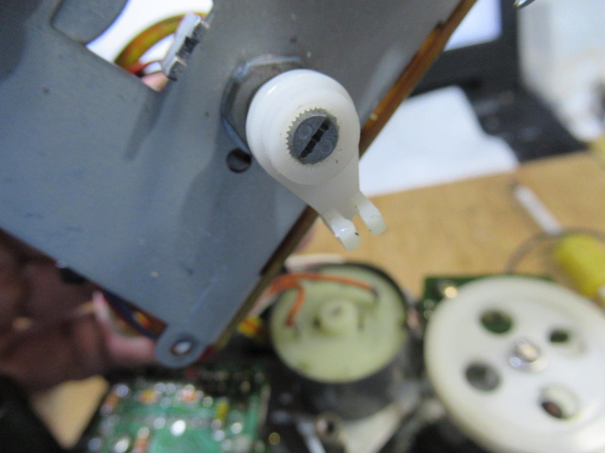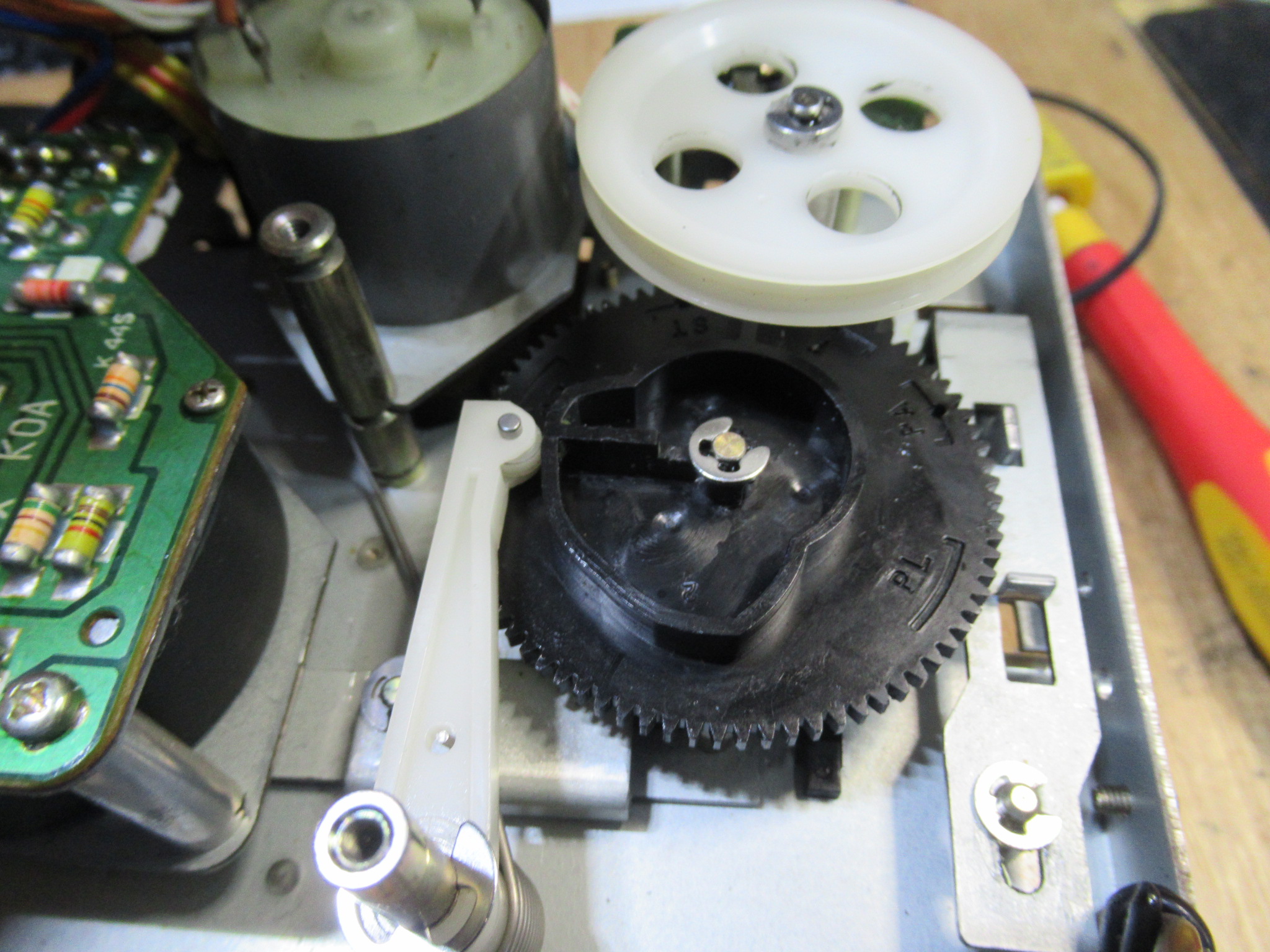 この写真は先ほどのカムギヤと組み合わさる箇所です。ここにカムギヤの回転を検知するVOLが取り付けられているのですが、なぜかVOLのシャフトが固着して回りません。そこで、接点復活剤を処置し、マイナスドライバーで回すことにより固着が解消されました。