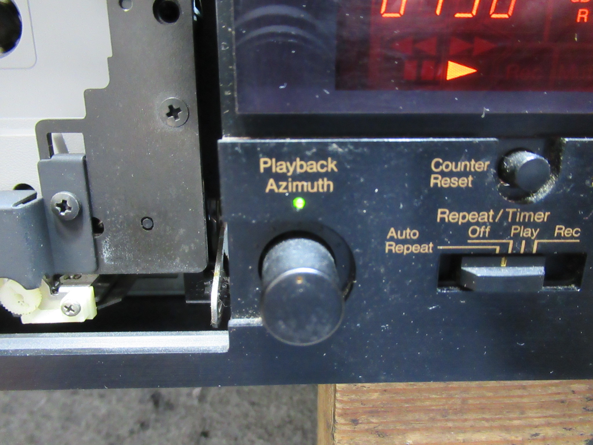アジマス調整ツマミをセンターに合わせ、再生ヘッドのアジマス調整を行います。