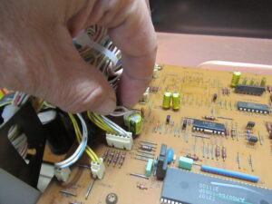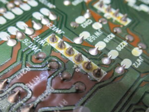 コントロール基板を取り外し、点検を行います。予想どおりコネクタの取り付け部分に半田割れが多数発生していました。以前の修理者が取り外すときに無理やり引き抜いたことが原因と考えられます。コネクタにはロックが掛かるようになっていますので、引き抜くときには少しコツが必要です。