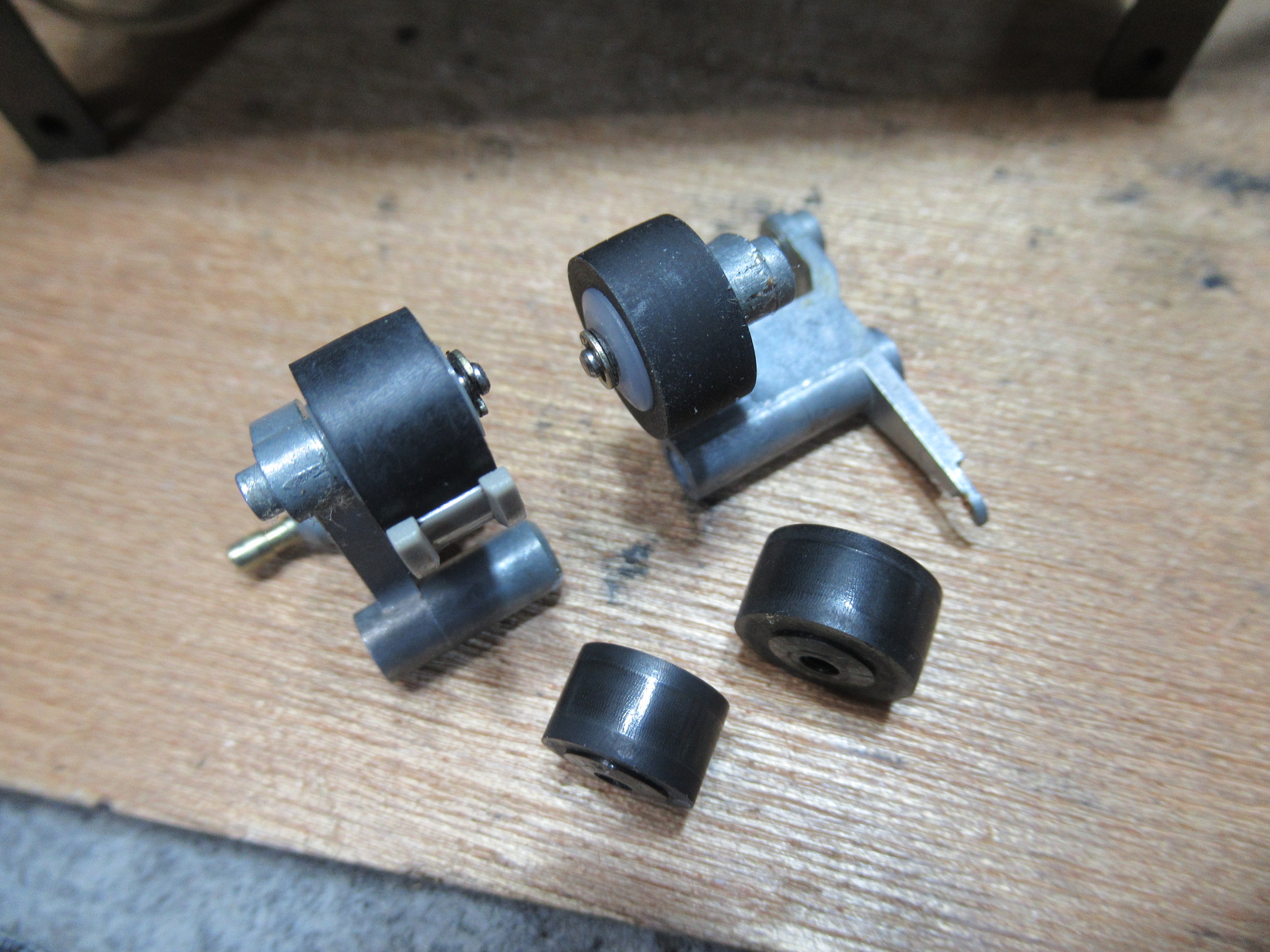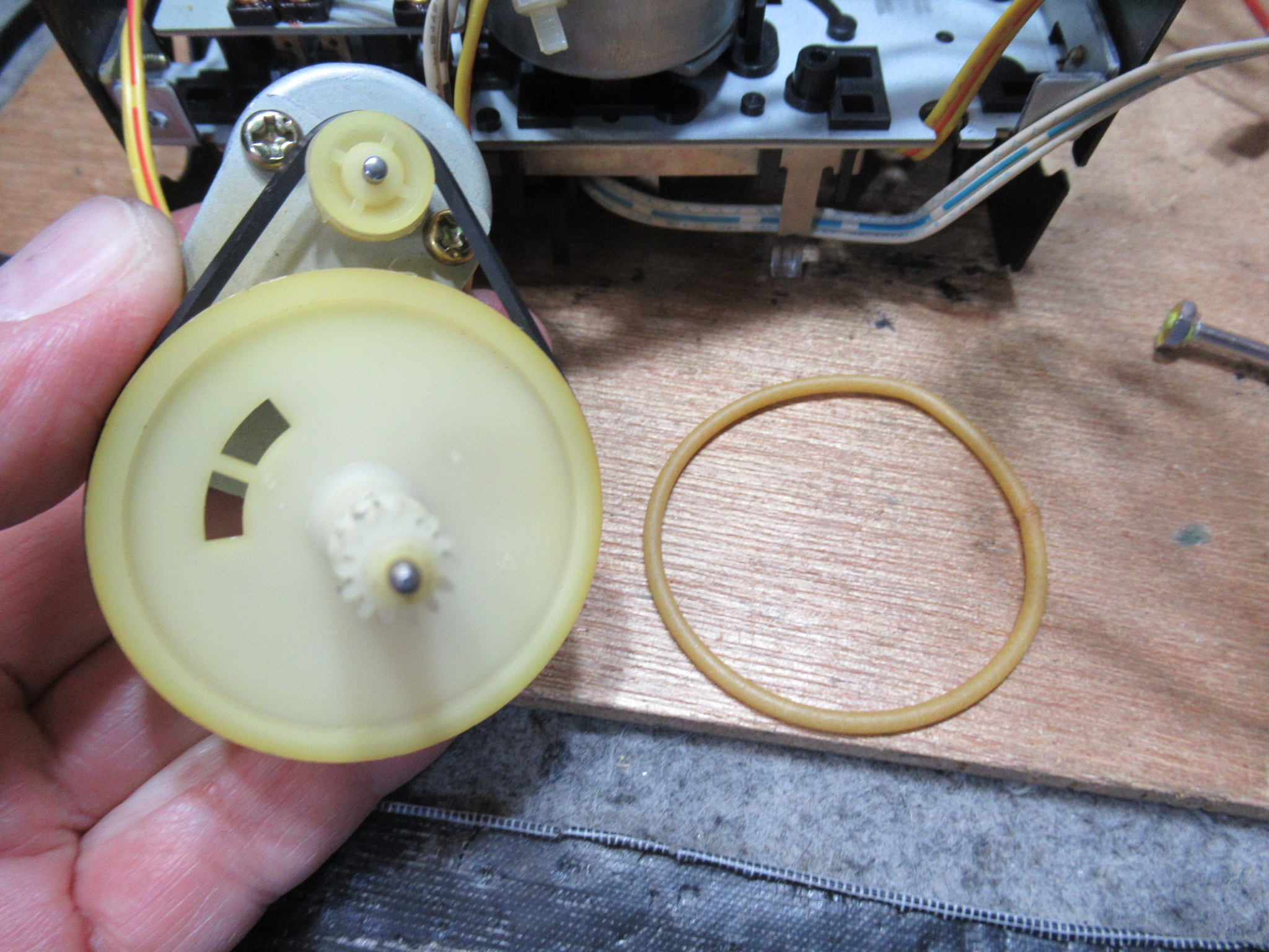 少し驚きましたが、アイドラーゴムを交換したところ、元々のものは、小さなものと一回り大きなものを2ケ重ねてありました。おそらく丁度良いサイズのものが入手できないための苦肉の策でしょうが、少し乱暴です。