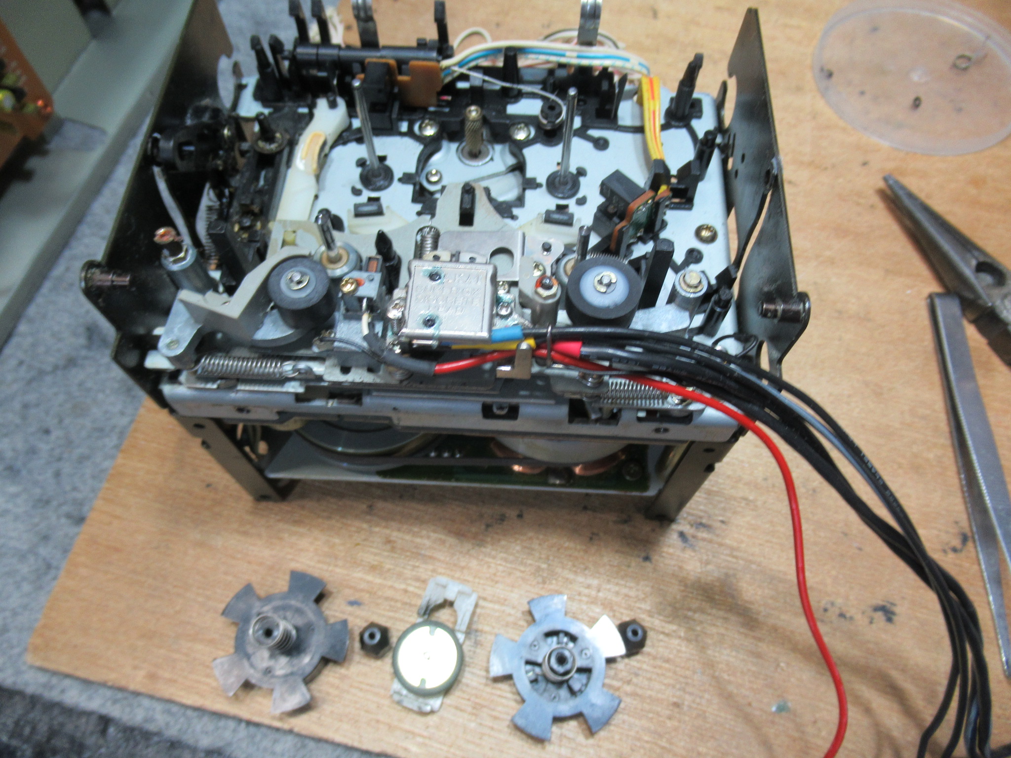 操作を繰り返していると、停止ボタンを押すとリールの回転のみ停止することがあります。そのためピンチローラーでテープが送られ続け、テープが巻き込むことがわかりました。