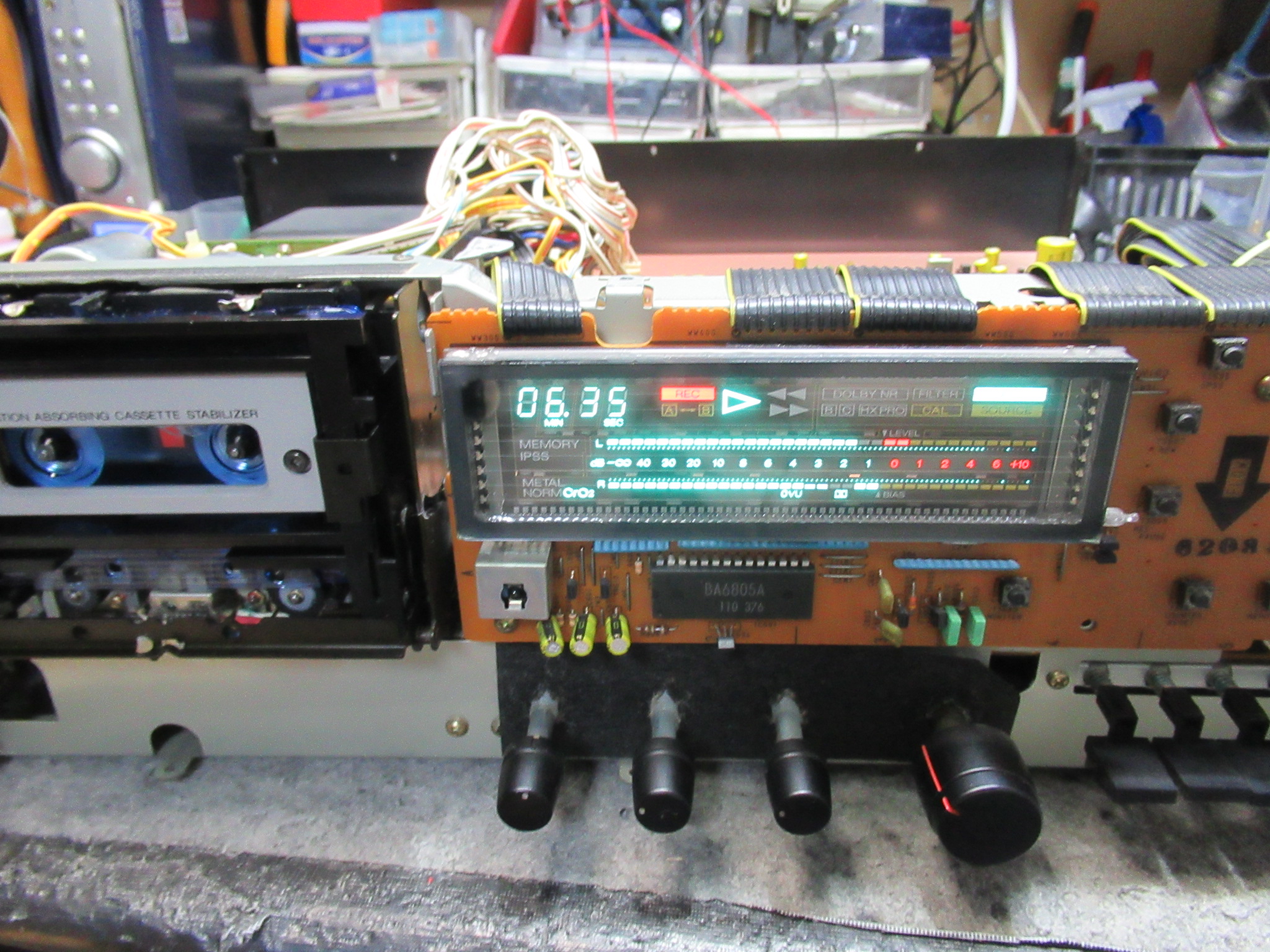 録音状況を確認して修理完了というところですが、最後に思わぬトラブルが発生しました。少しの間、他の作業をしながら再生を続けていましたが、突然音が止まりました。テープが終了したのだと思い、機器を見てみると、