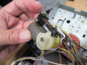 化粧パネルを取り外し、トレイ開閉を検知するスイッチ接点を磨きます。
