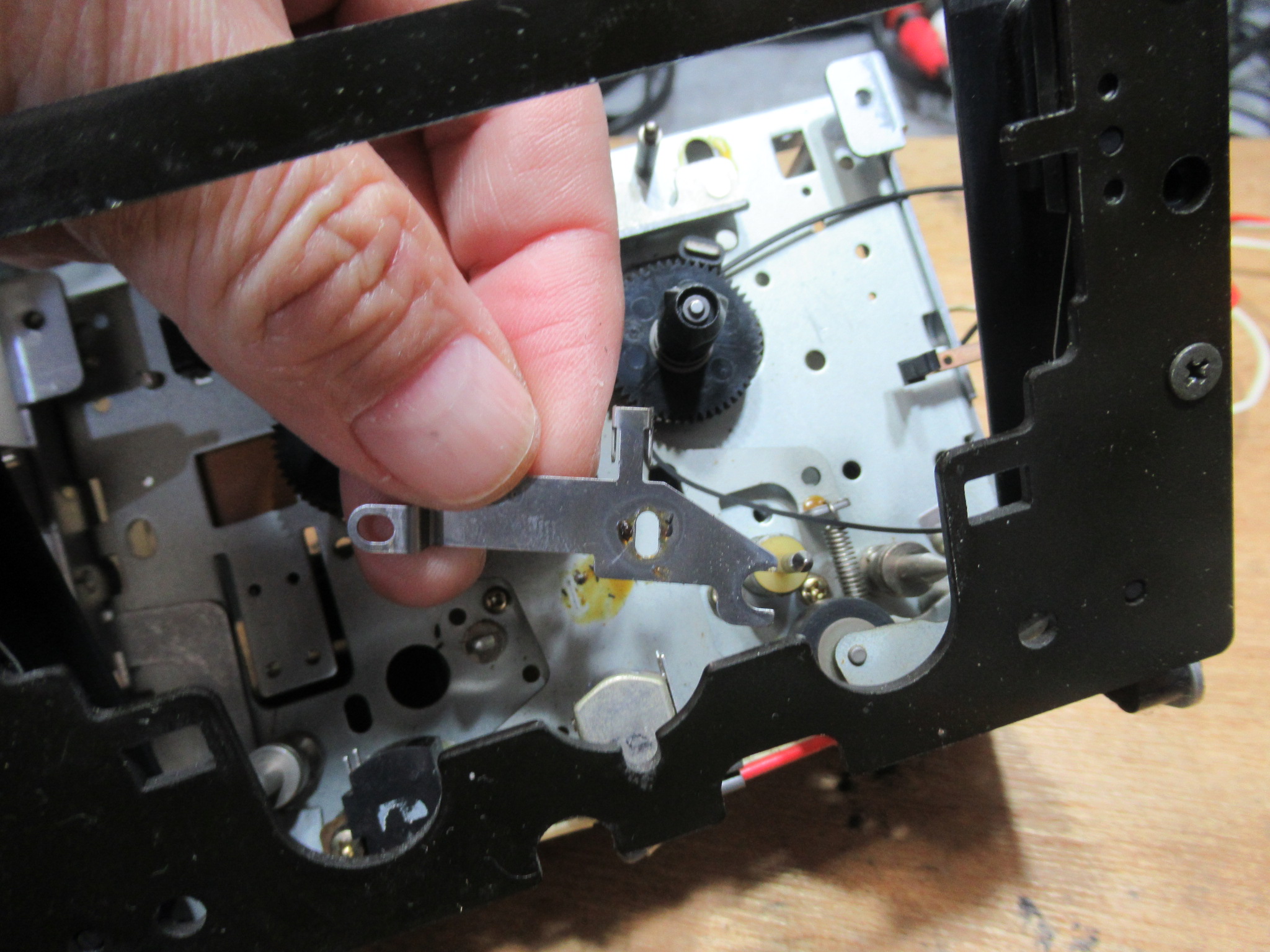 化粧パネルを取り外し、トレイ開閉を検知するスイッチ接点を磨きます。