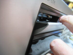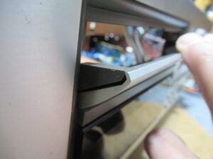 トレイ開閉の不具合が発生する原因はいくつかありますが、そのひとつは、リッドの化粧カバーが浮いて、フロントパネルと擦れることです。