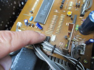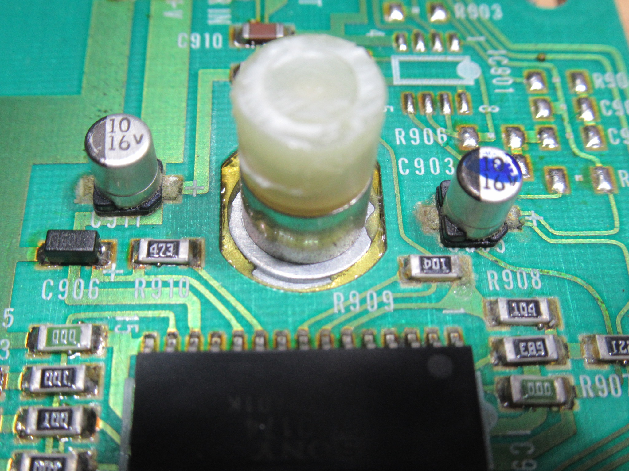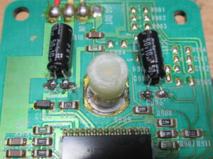 液漏れで若干基板面が傷んでいますので、確実に取り付けできるリードタイプの電解コンデンサーに置換します。