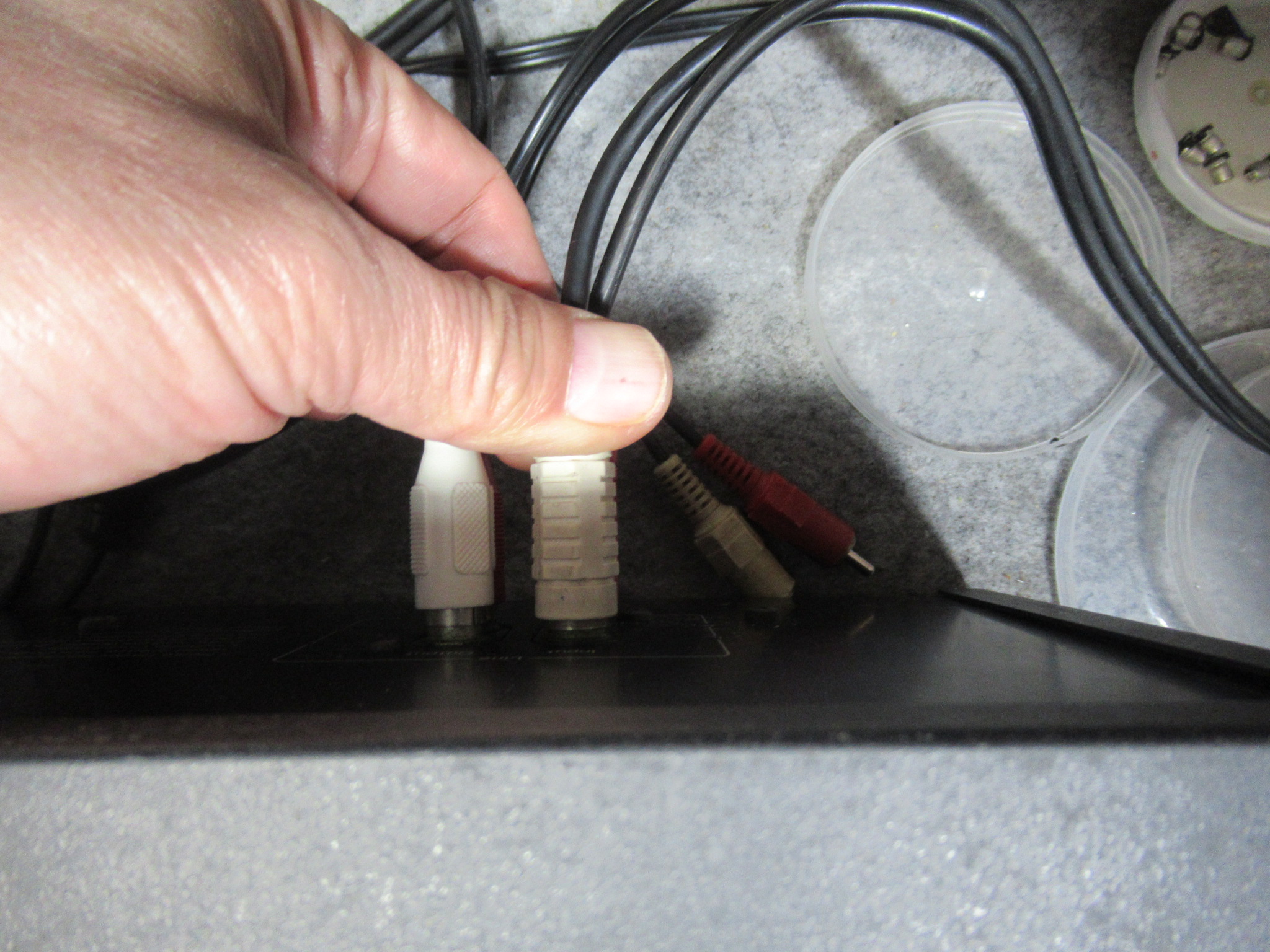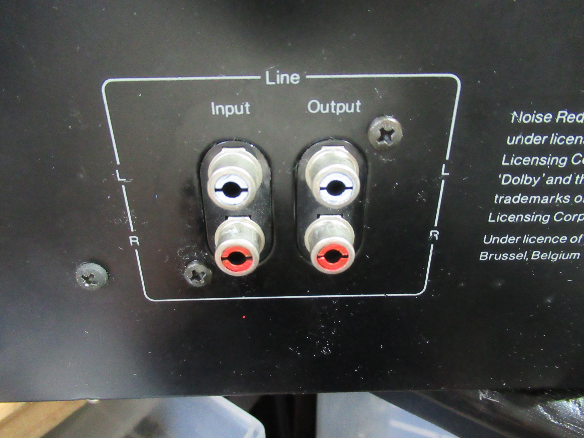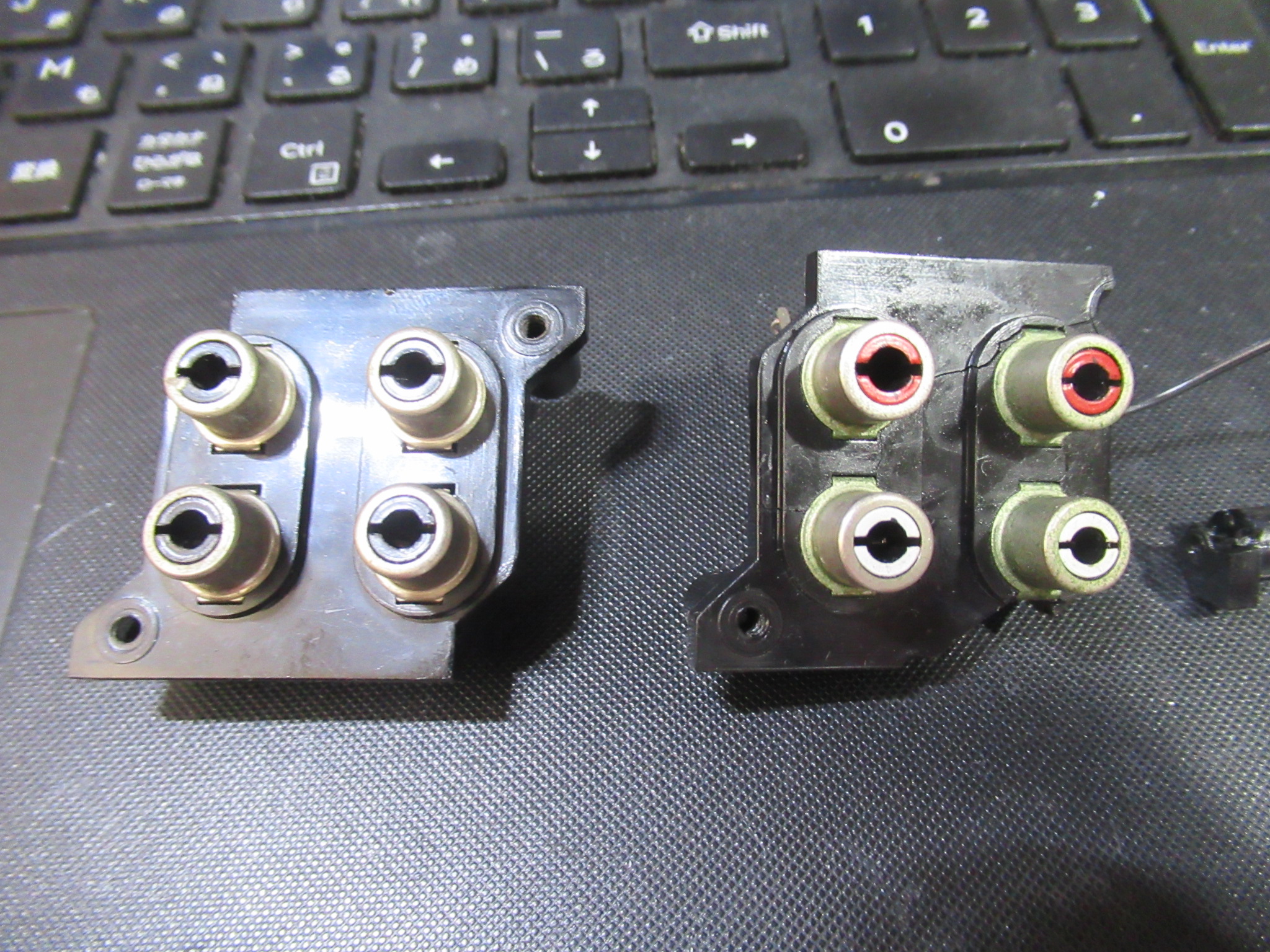 背面の入出力端子は、プラスチック部分が割れていましたので交換を行いますが、入手できたのは白赤の色分けが無いものしかありませんでした。