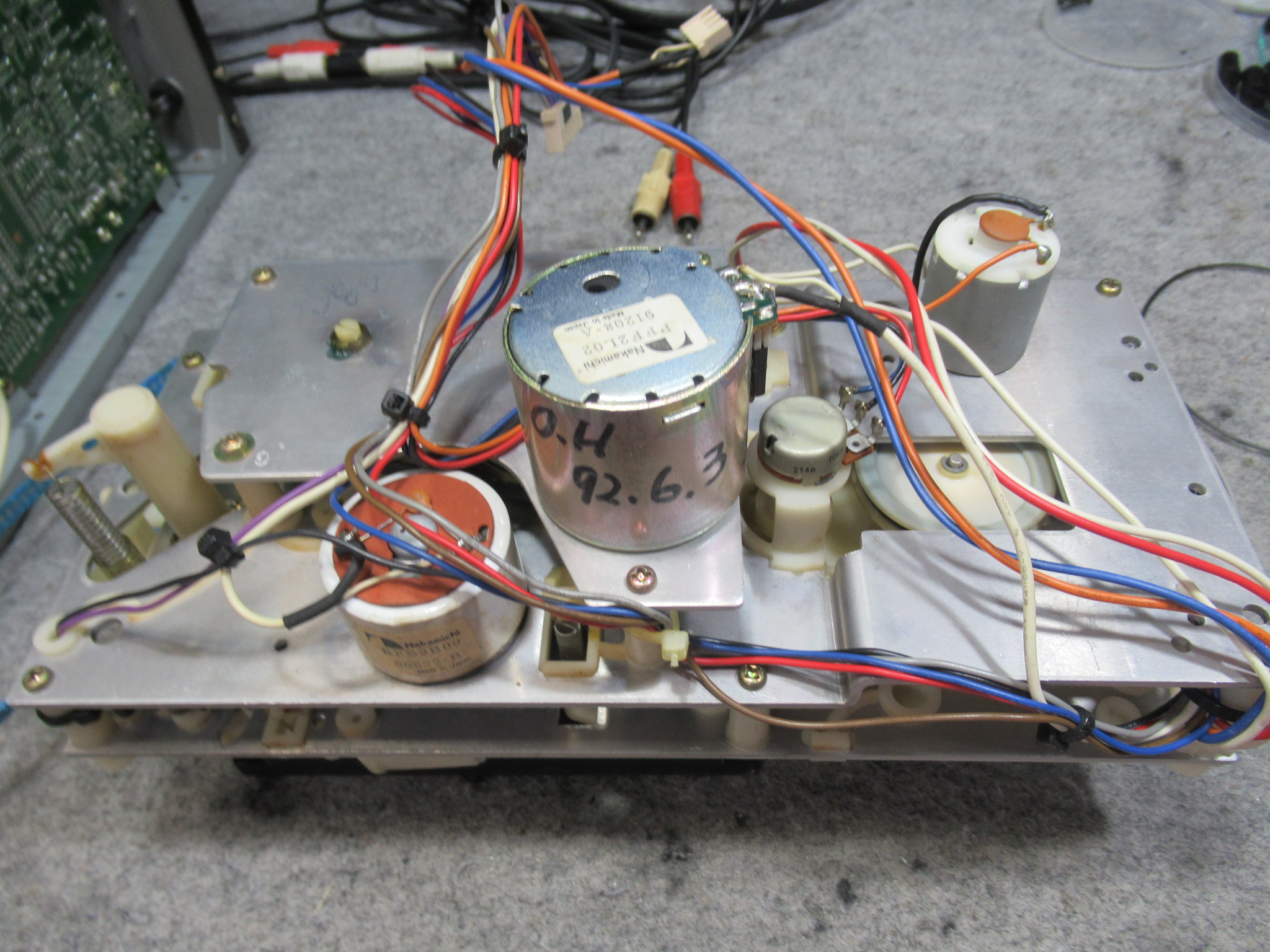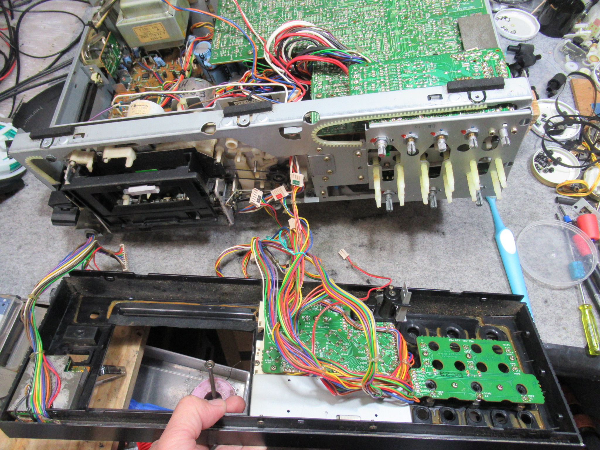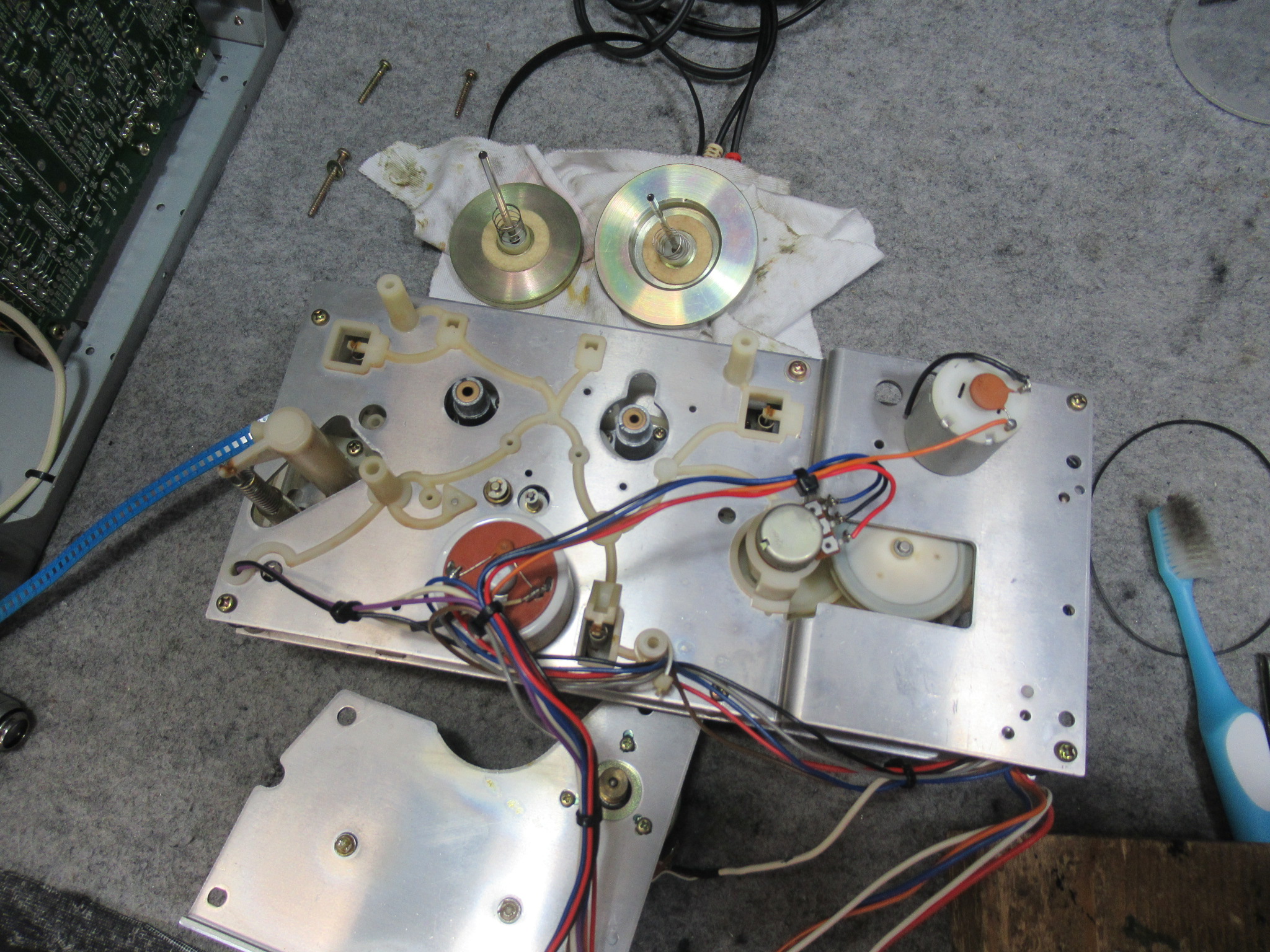 ナカミチのZX-7の修理依頼をいただきました。 動作不可状態です。 操作ボタンを押すとモーター音が鳴りますが、動きません。 ピンチローラーアームが固着しています。この修理は非常に厄介です。 トレイを開 …