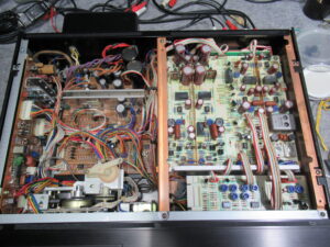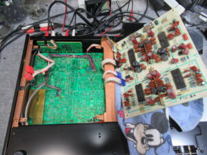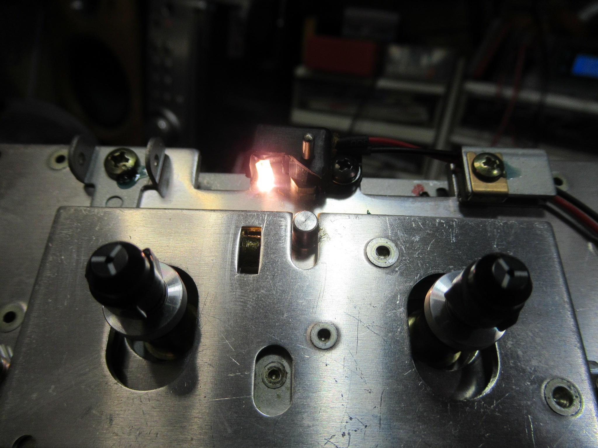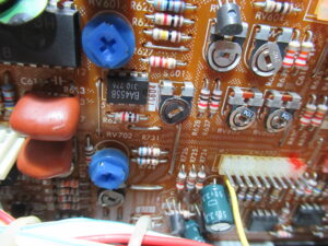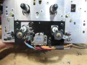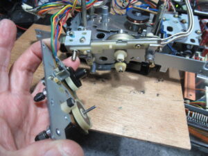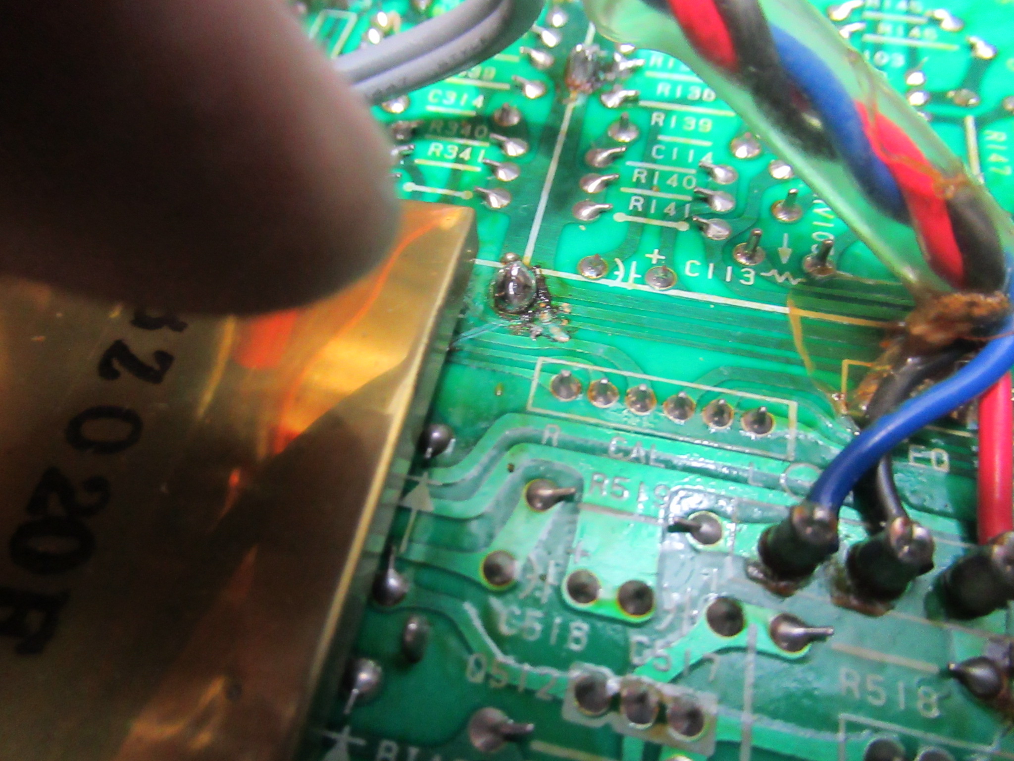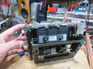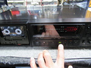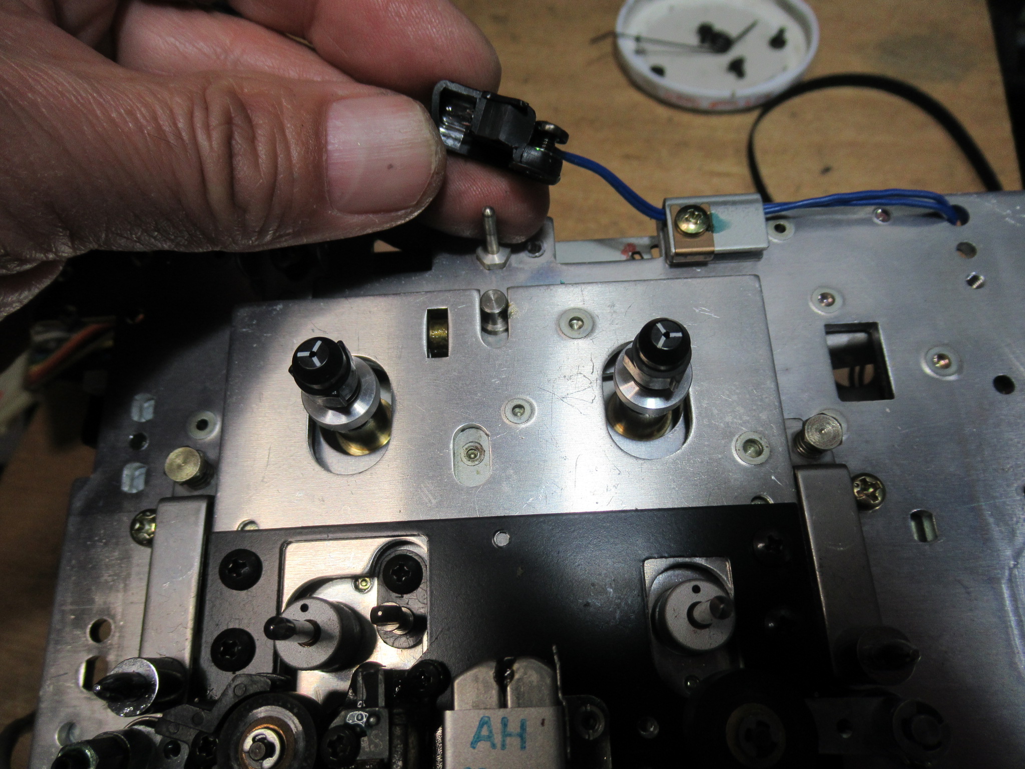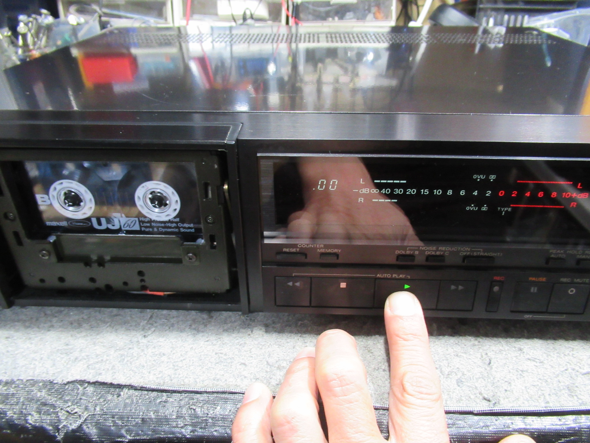 本体に組み込んで動作確認を行います。テープ走行は良好ですが、ご覧のとおりメーターが振り切っています。また、出力される音は、リバーブが掛かったような奥まった音です。これらはアース不良のときに起こる症状です。