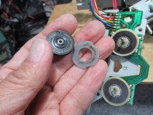 この機種は、マグネットの磁力でバックテンションを発生させますが、磁力をリールに伝達するためのスチールプレートが剥がれていました。