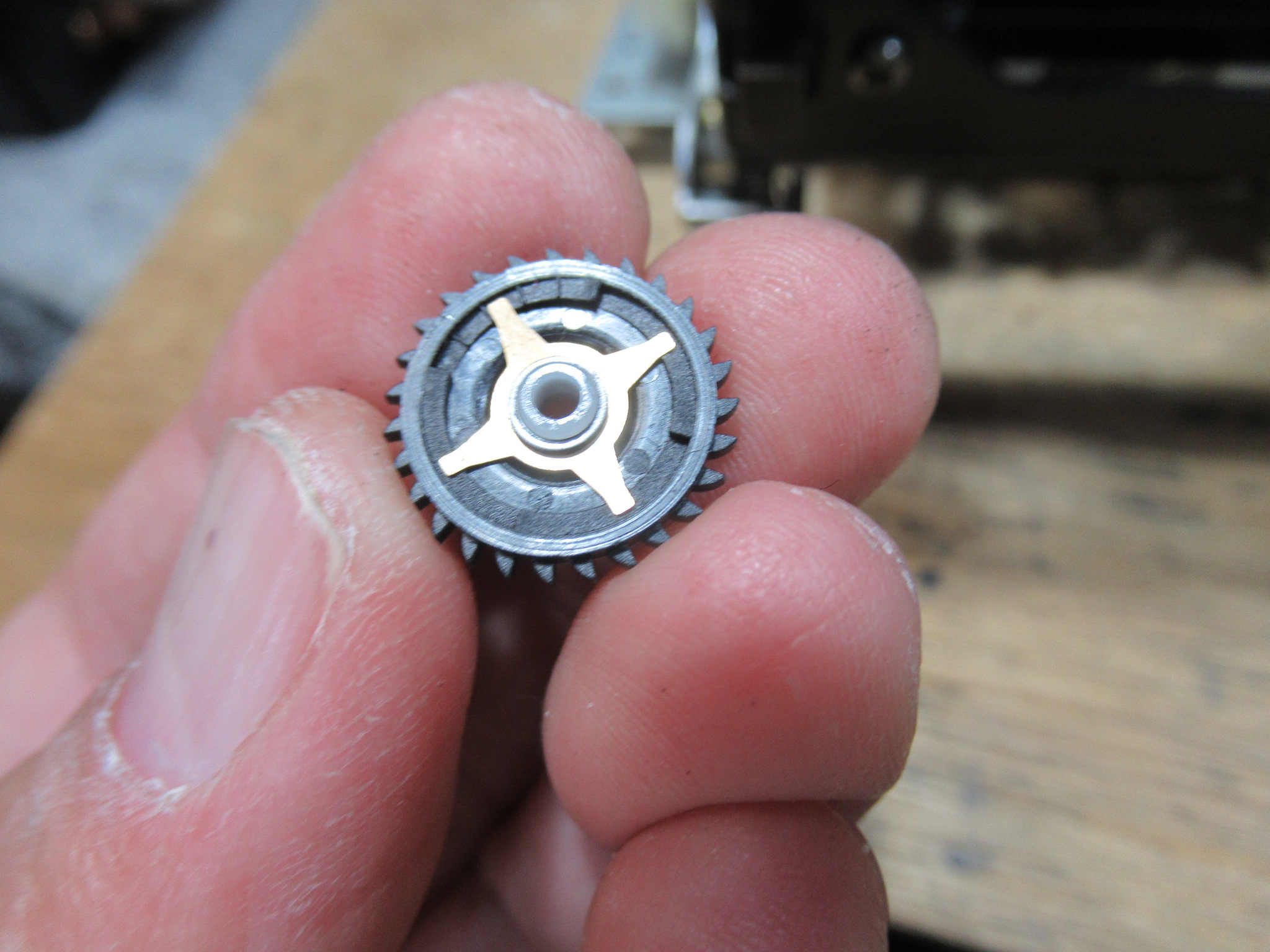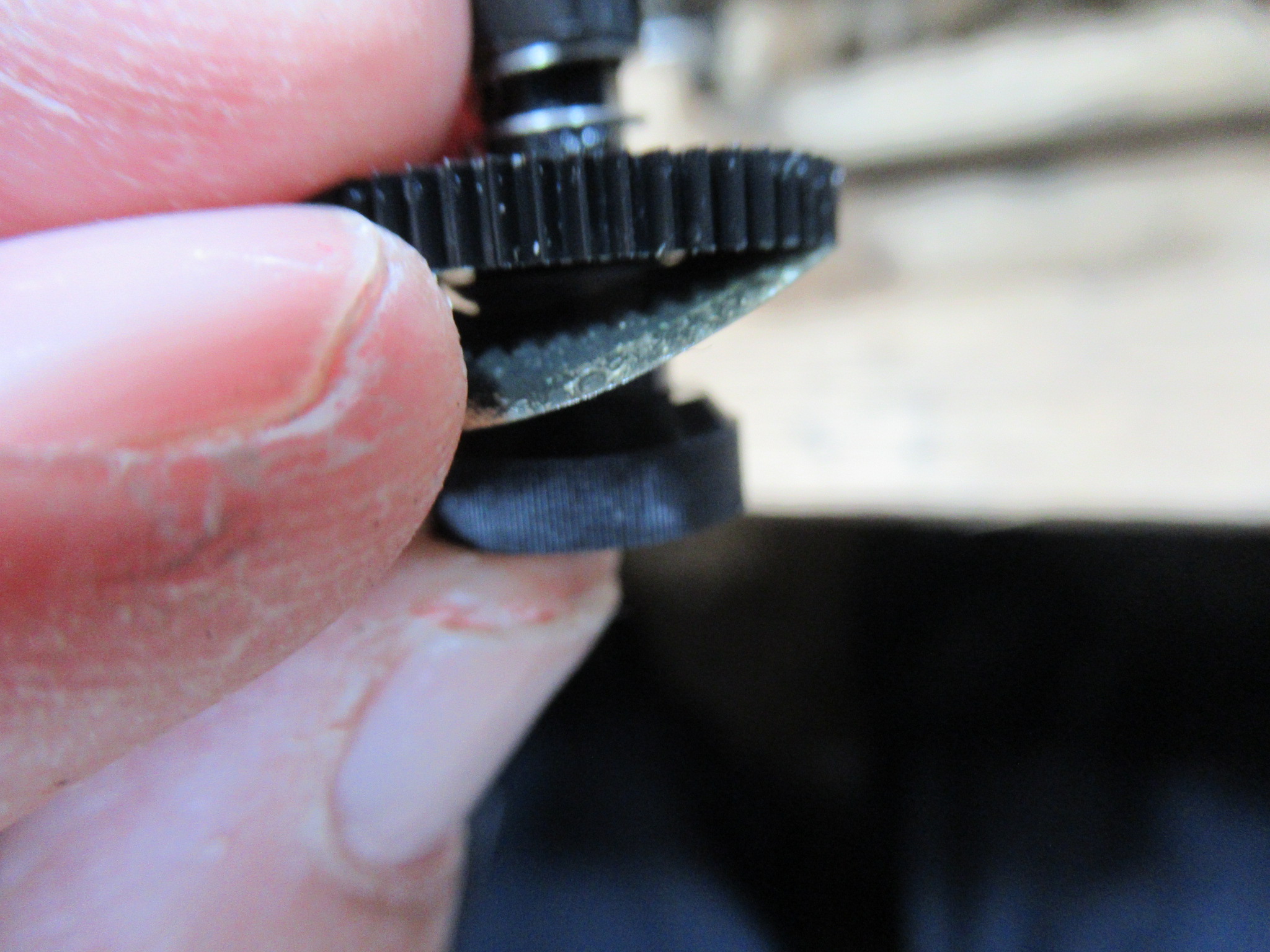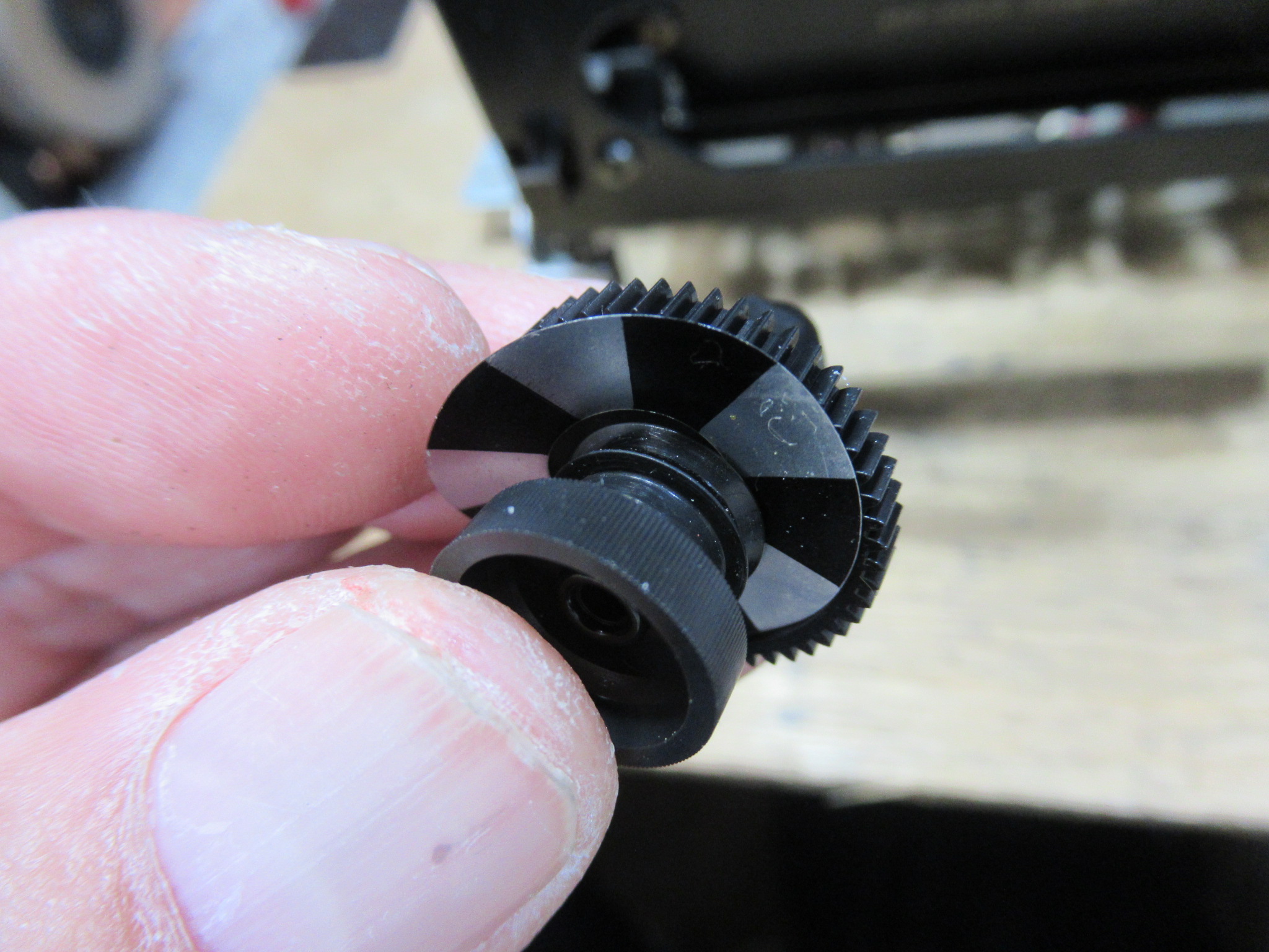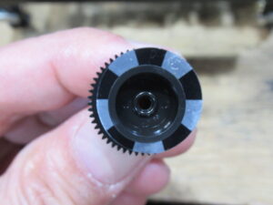 リール台の裏側には回転センサーの光を反射するための黒銀のシートが貼られていますが、