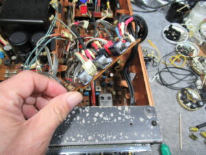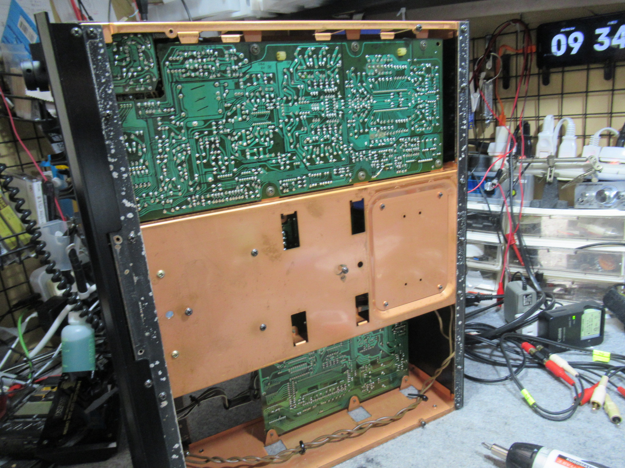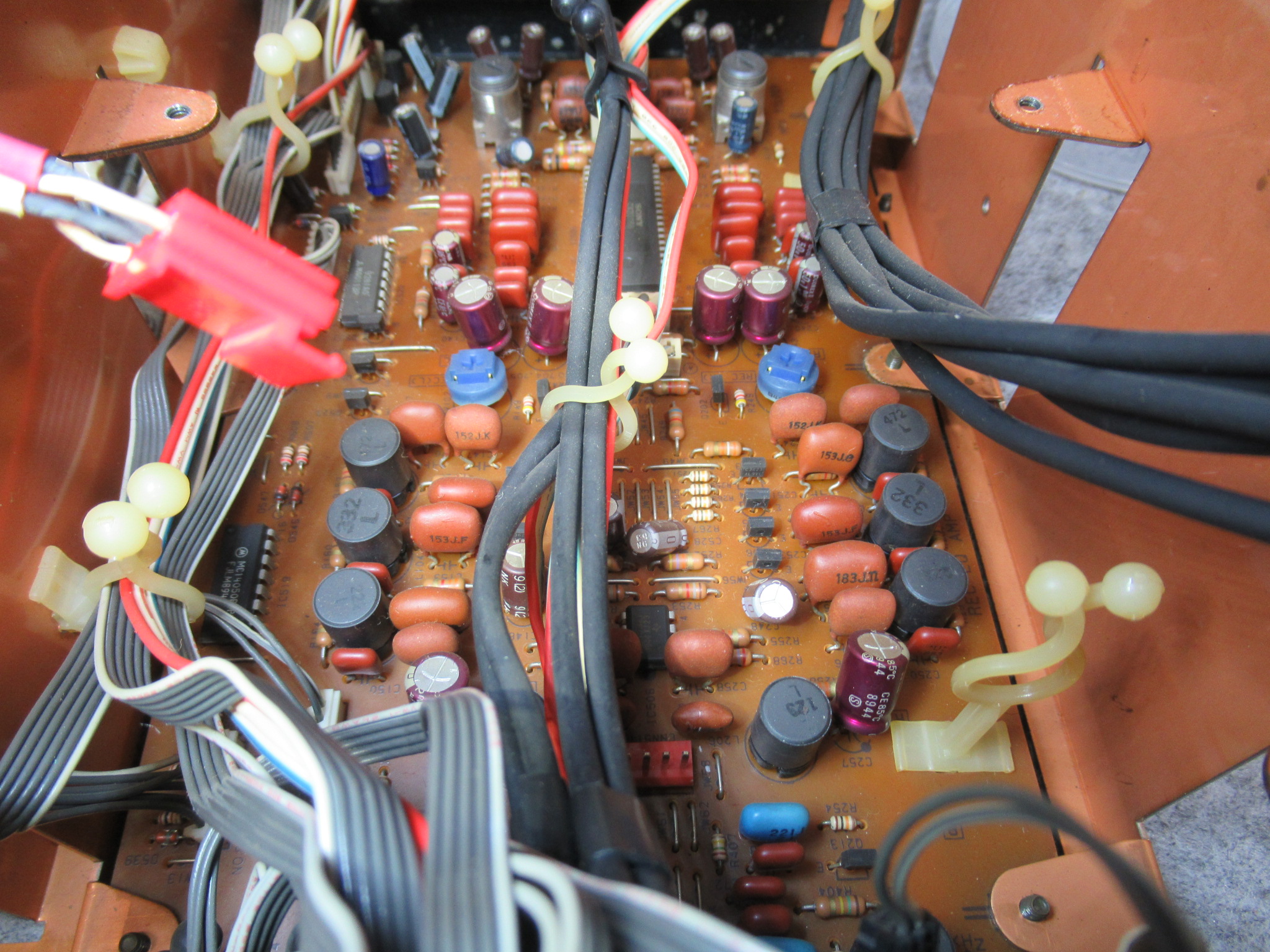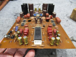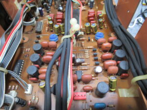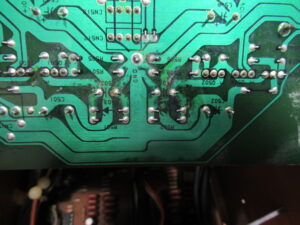 液漏れで汚れています。これらは、ELNA社製の電解コンデンサーによるものですので、後ほど全交換します。